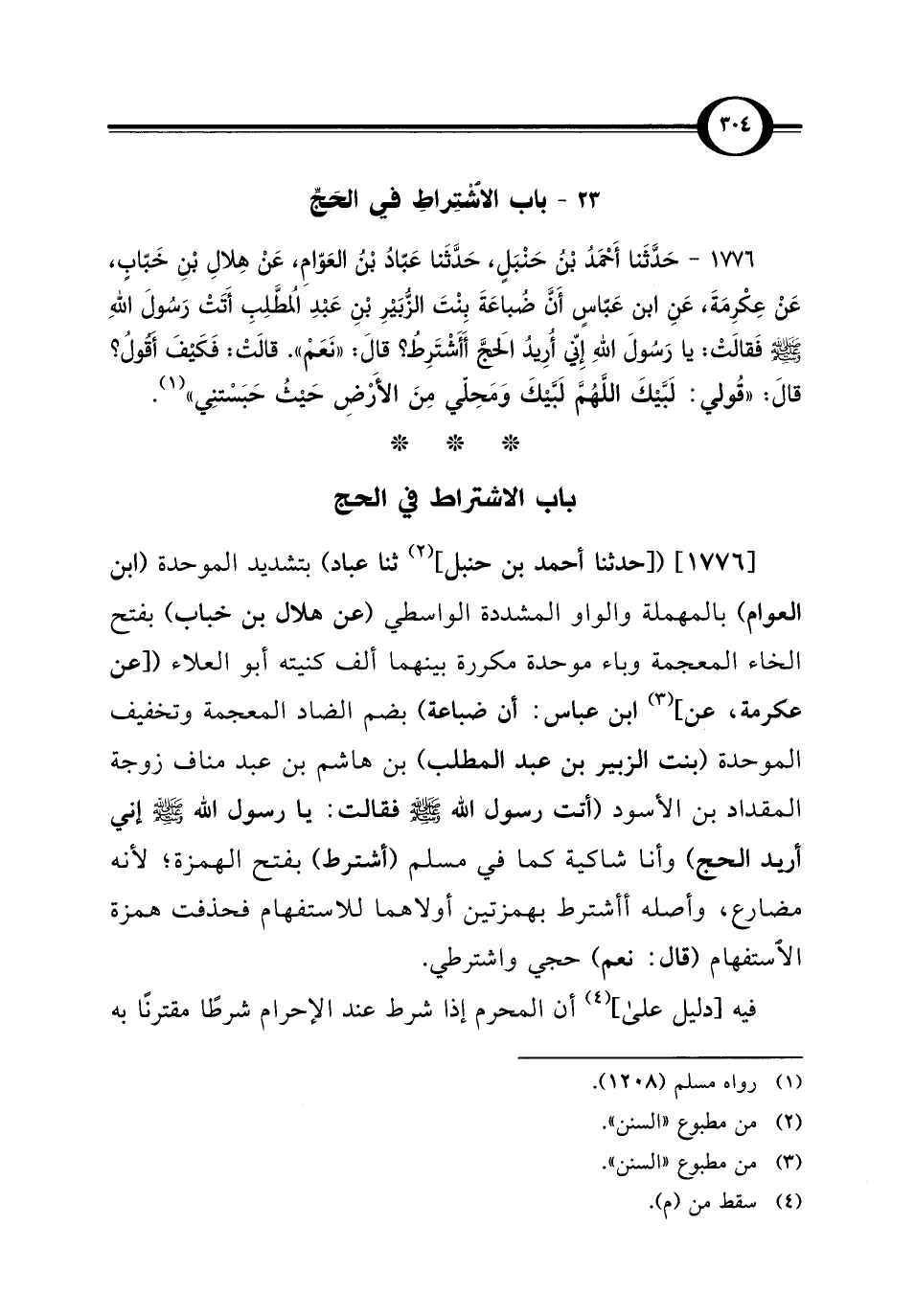 1776 - حَدَّثَنا أَحْمَدُ بْنُ حَنْبَلٍ، حَدَّثَنا عَبّادُ بْنُ العَوّامِ، عَنْ هِلالِ بْنِ خَبّابٍ، عَنْ عِكْرِمَةَ، عَنِ ابن عَبّاسٍ أَنَّ ضُباعَةَ بِنْتَ الزُّبَيْرِ بْنِ عَبْدِ المُطَّلِبِ أَتَتْ رَسُولَ اللهِ - صلى الله عليه وسلم - فَقَالَتْ: يا رَسُولَ اللهِ إِنّي أُرِيدُ الحَجَّ أَأَشْتَرِطُ؟ قَالَ: "نَعَمْ". قَالَتْ: فَكَيْفَ أَقُولُ؟ قَالَ: "قُولي: لَبَّيكَ اللَّهُمَّ لَبَّيْكَ وَمَحِلّي مِنَ الأَرْضِ حَيْثُ حَبَسْتنِي" (¬1).