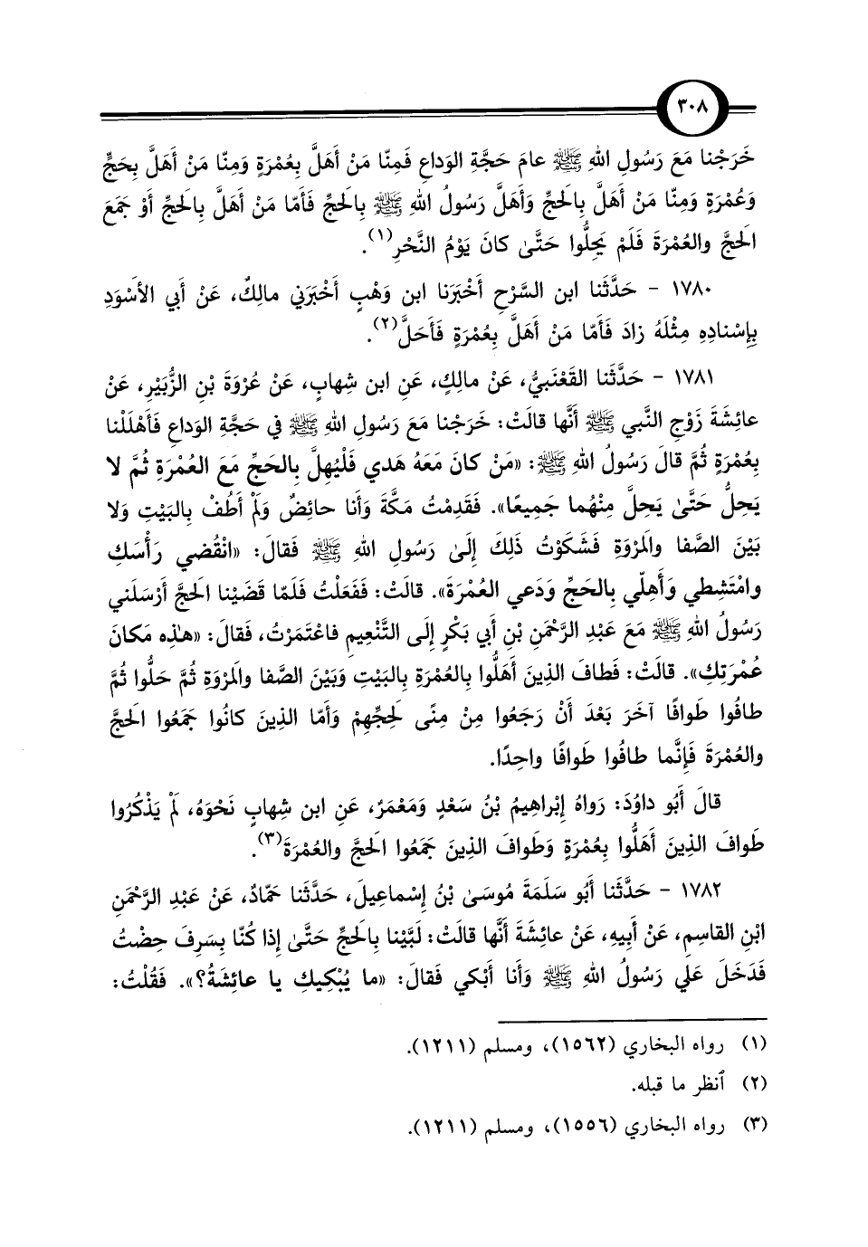 1781 - حَدَّثَنا القَعْنَبيُّ، عَنْ مالِكٍ، عَنِ ابن شِهابٍ، عَنْ عُرْوَةَ بْنِ الزُّبَيْرِ، عَنْ عَائِشَةَ زَوْجِ النَّبي - صلى الله عليه وسلم - أَنَّها قَالَتْ: خَرَجْنا مَعَ رَسُولِ اللهِ - صلى الله عليه وسلم - في حَجَّةِ الوَداعِ فَأَهْلَلْنا بِعُمْرَةٍ ثُمَّ قَالَ رَسُولُ اللهِ - صلى الله عليه وسلم -: "مَنْ كانَ مَعَهُ هَدي فَلْيُهِلَّ بِالحَجِّ مَعَ العُمْرَةِ ثُمَّ لا يَحِلُّ حَتَّى يَحِلَّ مِنْهُما جَمِيعًا". فَقَدِمْتُ مَكَّةَ وَأَنا حائِضٌ وَلَمْ أَطُفْ بِالبَيْتِ وَلا بَيْنَ الصَّفا والمَرْوَةِ فَشَكَوْتُ ذَلِكَ إِلَى رَسُولِ اللهِ - صلى الله عليه وسلم - فَقَالَ: "انْقُضي رَأْسَكِ وامْتَشِطي وَأَهِلّي بِالحَجِّ وَدَعي العُمْرَةَ". قَالَتْ: فَفَعَلْتُ فَلَمّا قَضَيْنا الحَجَّ أَرْسَلَني رَسُولُ اللهِ - صلى الله عليه وسلم - مَعَ عَبْدِ الرَّحْمَنِ بْنِ أَبي بَكْرٍ إِلَى التَّنْعِيمِ فاعْتَمَرْتُ، فَقَالَ: "هذِه مَكانَ عُمْرَتِكِ". قَالَتْ: فَطافَ الذِينَ أَهَلُّوا بِالعُمْرَةِ بِالبَيْتِ وَبَيْنَ الصَّفا والمَرْوَةِ ثُمَّ حَلُّوا ثُمَّ طافُوا طَوافًا آخَرَ بَعْدَ أَنْ رَجَعُوا مِنْ مِنًى لِحَجِّهِمْ وَأَمّا الذِينَ كَانُوا جَمَعُوا الحَجَّ والعُمْرَةَ فَإِنَّما طافُوا طَوافًا واحِدًا.