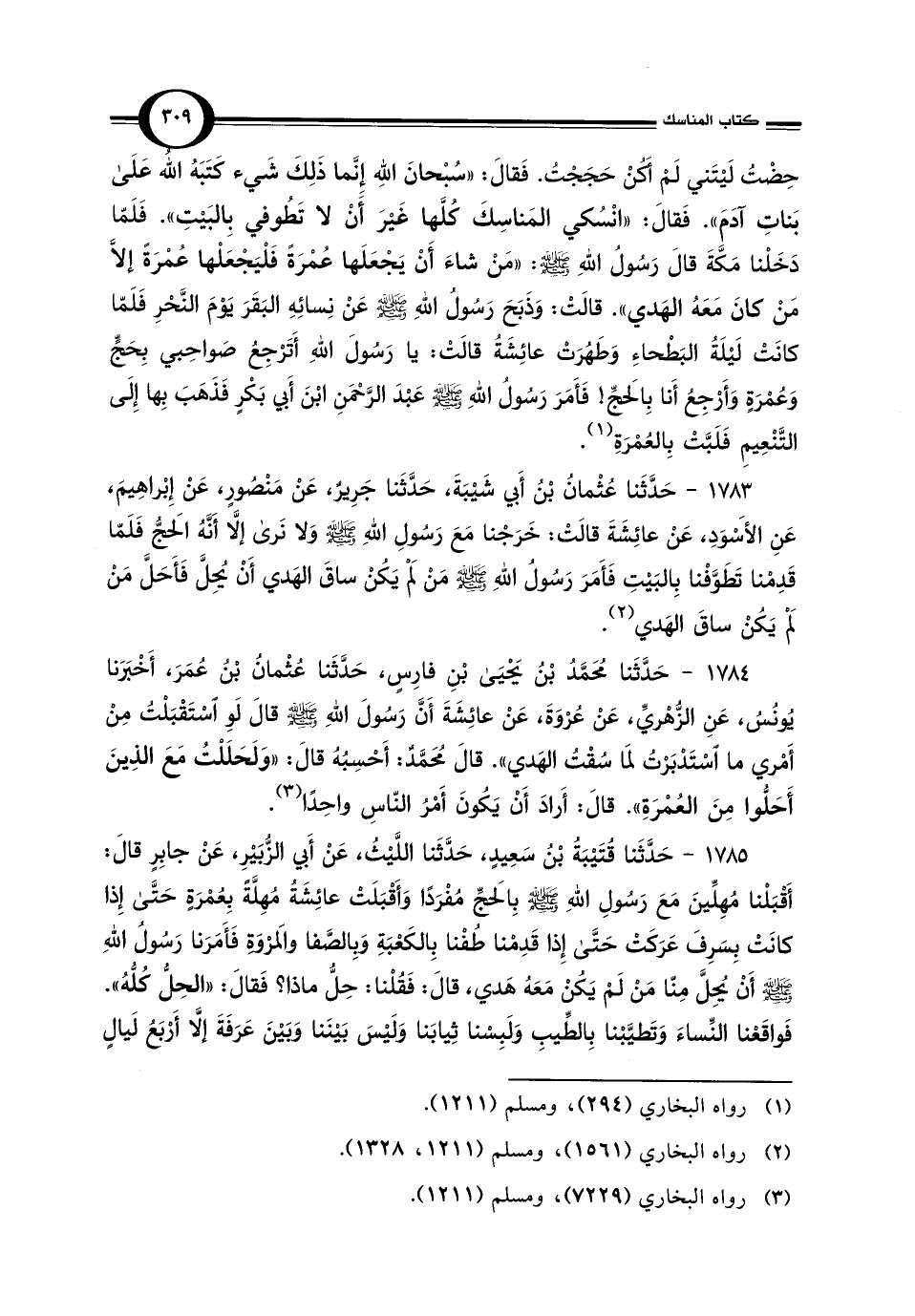1783 - حَدَّثَنا عُثْمانُ بْنُ أَبي شَيْبَةَ، حَدَّثَنا جَرِيرٌ، عَنْ مَنْصُورٍ، عَنْ إِبْراهِيمَ، عَنِ الأَسْوَدِ، عَنْ عَائِشَةَ قَالَتْ: خَرَجْنا مَعَ رَسُولِ اللهِ - صلى الله عليه وسلم - وَلا نَرى إلَّا أَنَّهُ الحَجُّ فَلَمّا قَدِمْنا تَطَوَّفْنا بِالبَيْتِ فَأَمَرَ رَسُولُ اللهِ - صلى الله عليه وسلم - منْ لَمْ يَكنْ ساقَ الهَدي أَنْ يُحِلَّ فَأَحَلَّ مَنْ لَمْ يَكُنْ ساقَ الهَدي (¬2).