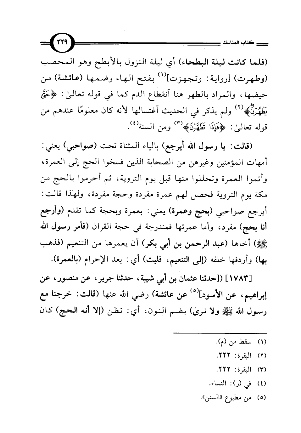 [1783] ([حدثنا عثمان بن أبي شيبة، حدثنا جرير، عن منصور، عن إبراهيم، عن الأسود] (¬5) عن عائشة) رضي الله عنها (قالت: خرجنا مع رسول الله - صلى الله عليه وسلم - ولا نرى) بضم النون، أي: نظن (إلا أنه الحج) كان
