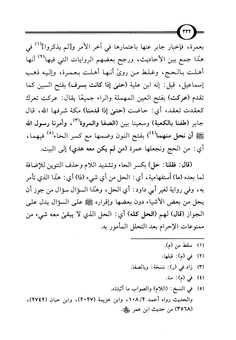 بعمرة، فإخبار جابر عنها باعتمارها في آخر الأمر و [لم يذكروا] (¬1) في هذا جمع بين الأحاديث، ورجح بعضهم الروايات التي فيها (¬2) أنها أهلت بالحج، وغلط من روى أنها أهلت بعمرة، وإليه ذهب إسماعيل، قيل: إنه ابن علية (حتى إذا كانت بسرف) بفتح السين كما تقدم (عركت) بفتح العين المهملة والراء جميعًا يقال: عركت تعرك كعقدت تعقد، أي: حاضت (حتى إذا قدمنا) مكة شرفها الله، قال جابر (طفنا بالكعبة) وسعينا بين (الصفا والمروة (¬3)، وأمرنا رسول الله - صلى الله عليه وسلم - أن نحل منهما) (¬4) بفتح النون وضمها مع كسر الحاء (¬5) فيهما، أي: من الحج ونجعلها عمرة (من لم يكن معه هدي) إلى البيت.
