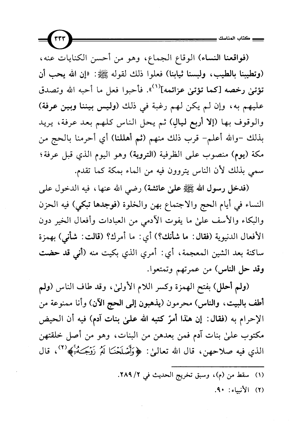 (فدخل رسول الله - صلى الله عليه وسلم - على عائشة) رضي الله عنها، فيه الدخول على النساء في أيام الحج والاجتماع بهن والخلوة (فوجدها تبكي) فيه الحزن والبكاء والأسف على ما يفوت الآدمي من العبادات وأفعال الخير دون الأفعال الدنيوية (فقال: ما شأنك؟ ) أي: ما أمرك؟ (قالت: شأني) بهمزة ساكنة بعد الشين المعجمة، أي: أمري الذي بكيت منه (أني قد حضت وقد حل الناس) من عمرتهم وتمتعوا.