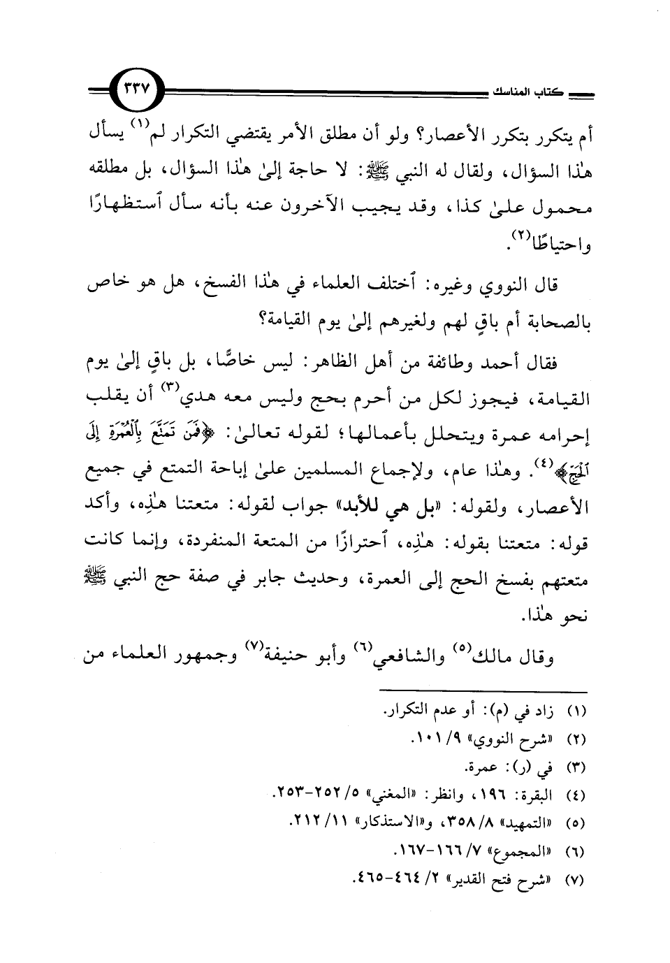 فقال أحمد وطائفة من أهل الظاهر: ليس خاصًّا، بل باقٍ إلى يوم القيامة، فيجوز لكل من أحرم بحج وليس معه هدي (¬3) أن يقلب إحرامه عمرة ويتحلل بأعمالها؛ لقوله تعالى: {فَمَنْ تَمَتَّعَ بِالْعُمْرَةِ إِلَى الْحَجِّ} (¬4). وهذا عام، ولإجماع المسلمين على إباحة التمتع في جميع الأعصار، ولقوله: "بل هي للأبد" جواب لقوله: متعتنا هذِه، وأكد قوله: متعتنا بقوله: هذِه، احترازًا من المتعة المنفردة، وإنما كانت متعتهم بفسخ الحج إلى العمرة، وحديث جابر في صفة حج النبي - صلى الله عليه وسلم - نحو هذا.
