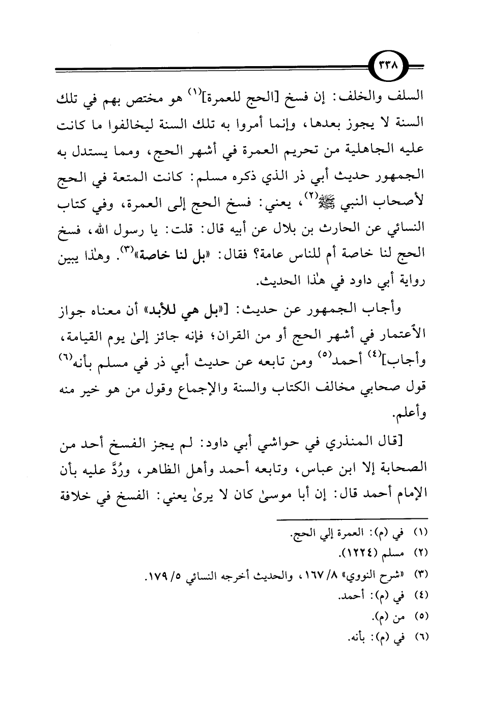 السلف والخلف: إن فسخ [الحج للعمرة] (¬1) هو مختص بهم في تلك السنة لا يجوز بعدها، وإنما أمروا به تلك السنة ليخالفوا ما كانت عليه الجاهلية من تحريم العمرة في أشهر الحج، ومما يستدل به الجمهور حديث أبي ذر الذي ذكره مسلم: كانت المتعة في الحج لأصحاب النبي - صلى الله عليه وسلم - (¬2)، يعني: فسخ الحج إلى العمرة، وفي كتاب النسائي عن الحارث بن بلال عن أبيه قال: قلت: يا رسول الله، فسخ الحج لنا خاصة أم للناس عامة؟ فقال: "بل لنا خاصة" (¬3). وهذا يبين رواية أبي داود في هذا الحديث.
