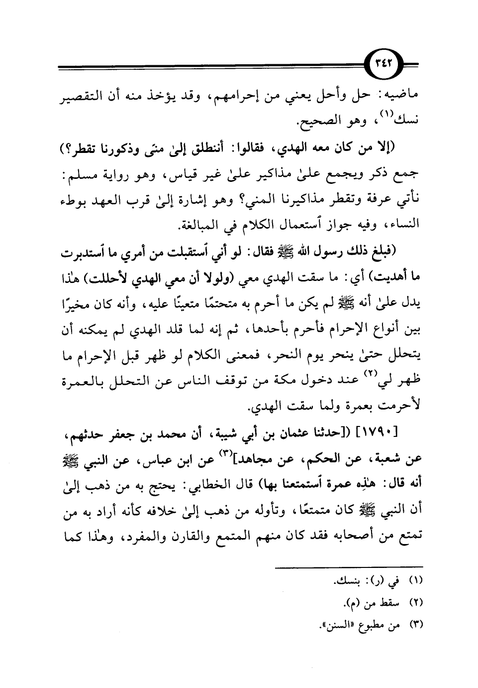 [1790] ([حدثنا عثمان بن أبي شيبة، أن محمد بن جعفر حدثهم، عن شعبة، عن الحكم، عن مجاهد] (¬3) عن ابن عباس، عن النبي - صلى الله عليه وسلم - أنه قال: هذِه عمرة استمتعنا بها) قال الخطابي: يحتج به من ذهب إلى أن النبي - صلى الله عليه وسلم - كان متمتعًا، وتأوله من ذهب إلى خلافه كأنه أراد به من تمتع من أصحابه فقد كان منهم المتمتع والقارن والمفرد، وهذا كما