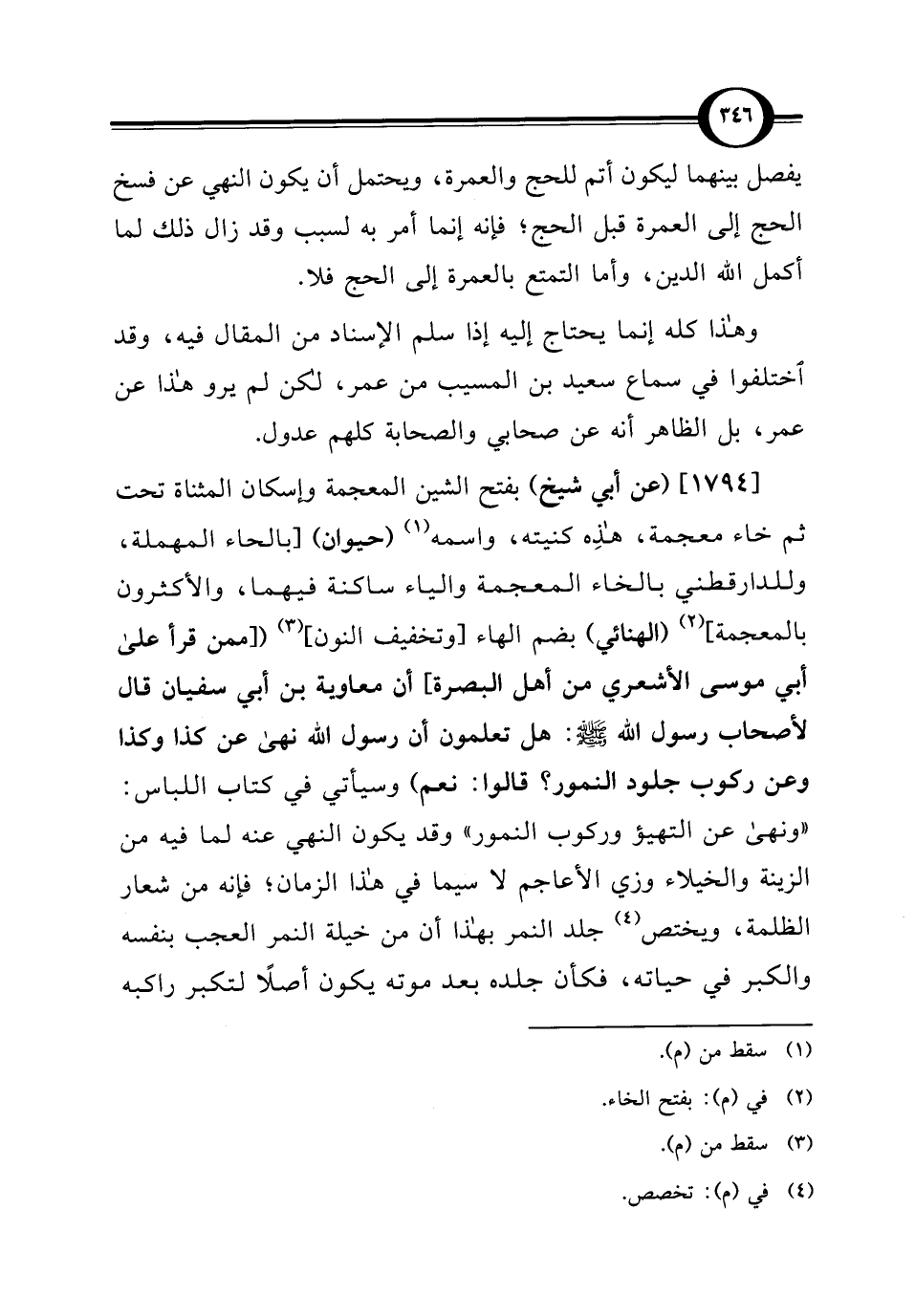[1794] (عن أبي شيخ) بفتح الشين المعجمة وإسكان المثناة تحت ثم خاء معجمة، هذِه كنيته، واسمه (¬1) (حيوان) [بالحاء المهملة، وللدارقطني بالخاء المعجمة والياء ساكنة فيهما، والأكثرون بالمعجمة] (¬2) (الهنائي) بضم الهاء [وتخفيف النون] (¬3) ([ممن قرأ على أبي موسى الأشعري من أهل البصرة] أن معاوية بن أبي سفيان قال لأصحاب رسول الله - صلى الله عليه وسلم -: هل تعلمون أن رسول الله نهى عن كذا وكذا وعن ركوب جلود النمور؟ قالوا: نعم) وسيأتي في كتاب اللباس: "ونهى عن التهيؤ وركوب النمور" وقد يكون النهي عنه لما فيه من الزينة والخيلاء وزي الأعاجم لا سيما في هذا الزمان؛ فإنه من شعار الظلمة، ويختص (¬4) جلد النمر بهذا أن من خيلة النمر العجب بنفسه والكبر في حياته، فكأن جلده بعد موته يكون أصلًا لتكبر راكبه
