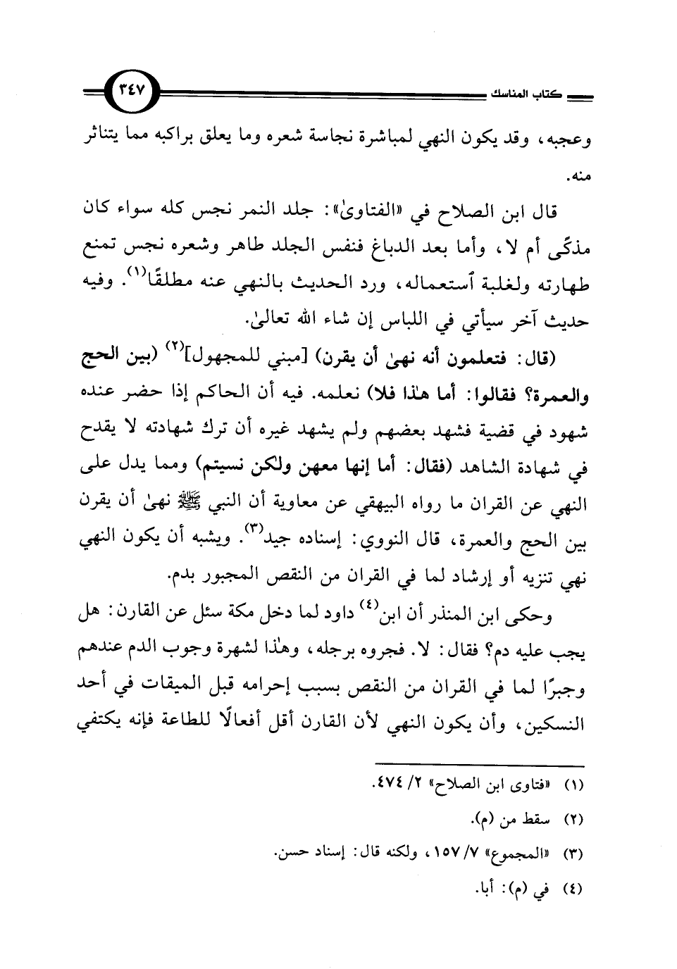 وحكى ابن المنذر أن ابن (¬4) داود لما دخل مكة سئل عن القارن: هل يجب عليه دم؟ فقال: لا. فجروه برجله، وهذا لشهرة وجوب الدم عندهم وجبرًا لما في القران من النقص بسبب إحرامه قبل الميقات في أحد النسكين، وأن يكون النهي لأن القارن أقل أفعالًا للطاعة فإنه يكتفي