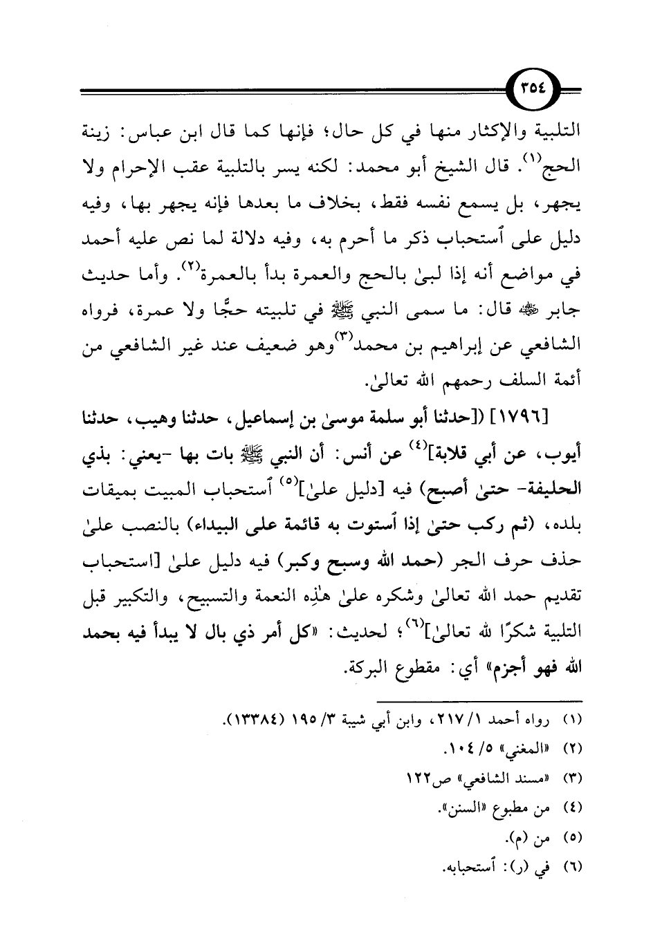 [1796] ([حدثنا أبو سلمة موسى بن إسماعيل، حدثنا وهيب، حدثنا أيوب، عن أبي قلابة] (¬4) عن أنس: أن النبي - صلى الله عليه وسلم - بات بها - يعني: بذي الحليفة - حتى أصبح) فيه [دليل على] (¬5) استحباب المبيت بميقات بلده, (ثم ركب حتى إذا استوت به قائمة على البيداء) بالنصب على حذف حرف الجر (حمد الله وسبح وكبر) فيه دليل على [استحباب تقديم حمد الله تعالى وشكره على هذِه النعمة والتسبيح، والتكبير قبل التلبية شكرًا لله تعالى] (¬6)؛ لحديث: "كل أمر ذي بال لا يبدأ فيه بحمد الله فهو أجزم" أي: مقطوع البركة.