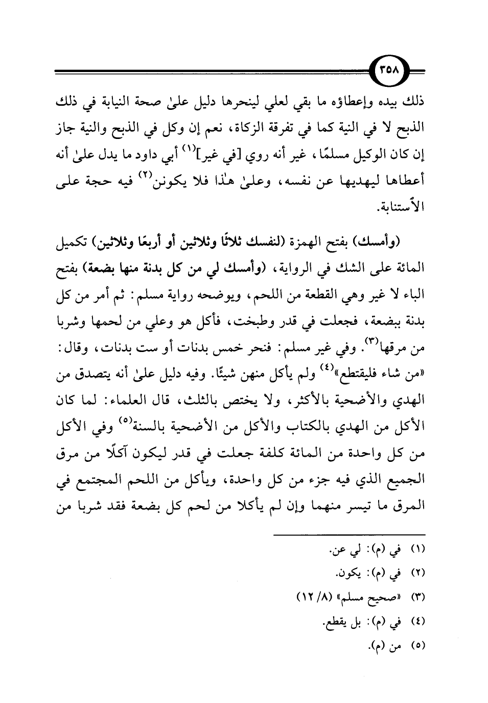 (وأمسك) بفتح الهمزة (لنفسك ثلاثًا وثلاثين أو أربعًا وثلاثين) تكميل المائة على الشك في الرواية, (وأمسك لي من كل بدنة منها بضعة) بفتح الباء لا غير وهي القطعة من اللحم، ويوضحه رواية مسلم: ثم أمر من كل بدنة ببضعة، فجعلت في قدر وطبخت، فأكل هو وعلي من لحمها وشربا من مرقها (¬3). وفي غير مسلم: فنحر خمس بدنات أو ست بدنات، وقال: "من شاء فليقتطع" (¬4) ولم يأكل منهن شيئًا. وفيه دليل على أنه يتصدق من الهدي والأضحية بالأكثر، ولا يختص بالثلث، قال العلماء: لما كان الأكل من الهدي بالكتاب والأكل من الأضحية بالسنة (¬5) وفي الأكل من كل واحدة من المائة كلفة جعلت في قدر ليكون آكلًا من مرق الجميع الذي فيه جزء من كل واحدة، ويأكل من اللحم المجتمع في المرق ما تيسر منهما وإن لم يأكلا من لحم كل بضعة فقد شربا من