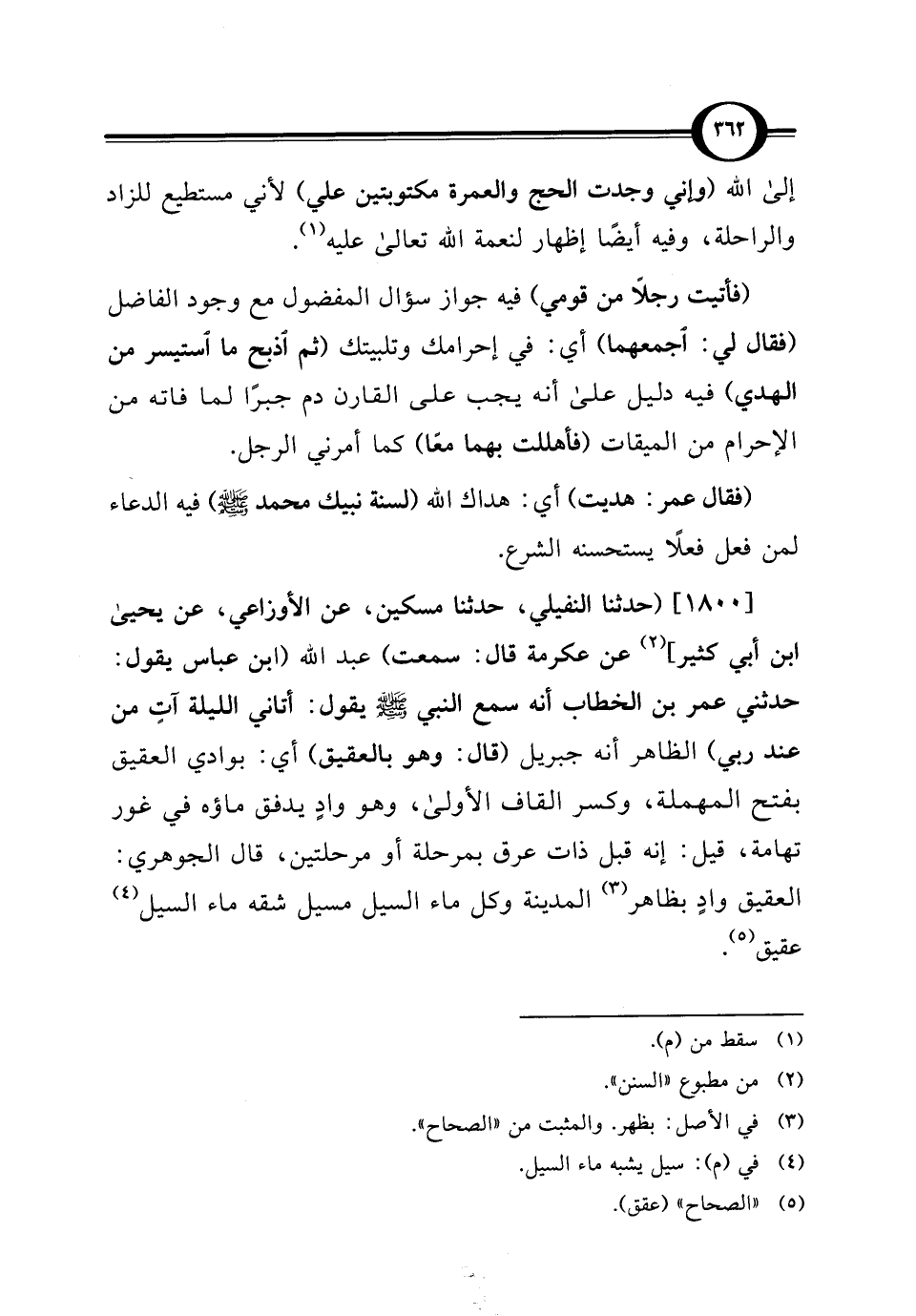 [1800] (حدثنا النفيلي، حدثنا مسكين، عن الأوزاعي، عن يحيى بن أبي كثير] (¬2) عن عكرمة قال: سمعت) عبد الله (ابن عباس يقول: حدثني عمر بن الخطاب أنه سمع النبي - صلى الله عليه وسلم - يقول: أتاني الليلة آتٍ من عند ربي) الظاهر أنه جبريل (قال: وهو بالعقيق) أي: بوادي العقيق بفتح المهملة، وكسر القاف الأولى، وهو وادٍ يدفق ماؤه في غور تهامة، قيل: إنه قبل ذات عرق بمرحلة أو مرحلتين، قال الجوهري: العقيق وادٍ بظاهر (¬3) المدينة وكل ماء السيل مسيل شقه ماء السيل (¬4) عقيق (¬5).