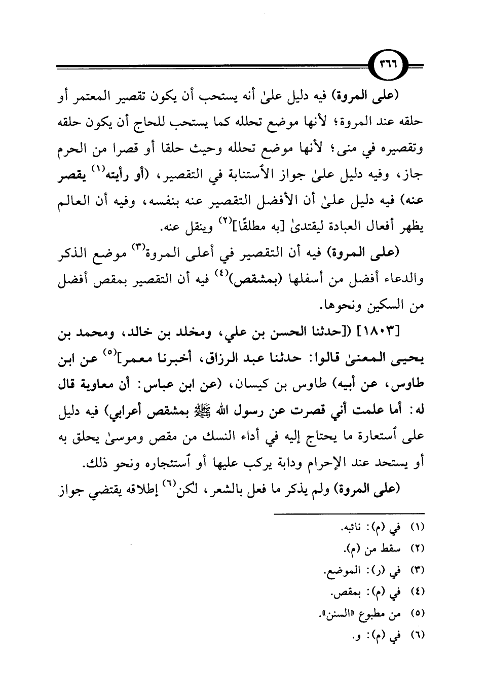 [1803] ([حدثنا الحسن بن علي، ومخلد بن خالد، ومحمد بن يحيى المعنى قالوا: حدثنا عبد الرزاق، أخبرنا معمر] (¬5) عن ابن طاوس، عن أبيه) طاوس بن كيسان, (عن ابن عباس: أن معاوية قال له: أما علمت أني قصرت عن رسول الله - صلى الله عليه وسلم - بمشقص أعرابي) فيه دليل على استعارة ما يحتاج إليه في أداء النسك من مقص وموسى يحلق به أو يستحد عند الإحرام ودابة يركب عليها أو استئجاره ونحو ذلك.