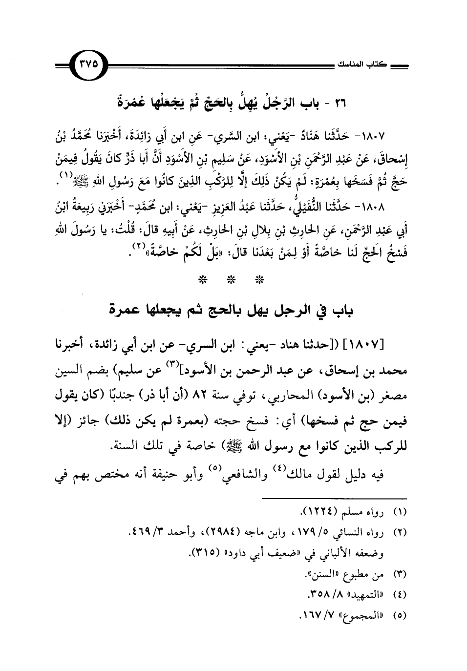 [1807] ([حدثنا هناد - يعني: ابن السري - عن ابن أبي زائدة، أخبرنا محمد بن إسحاق، عن عبد الرحمن بن الأسود] (¬3) عن سليم) بضم السين مصغر (بن الأسود) المحاربي، توفي سنة 82 (أن أبا ذر) جندبًا (كان يقول فيمن حج ثم فسخها) أي: فسخ حجته (بعمرة لم يكن ذلك) جائز (إلا للركب الذين كانوا مع رسول الله - صلى الله عليه وسلم -) خاصة في تلك السنة.