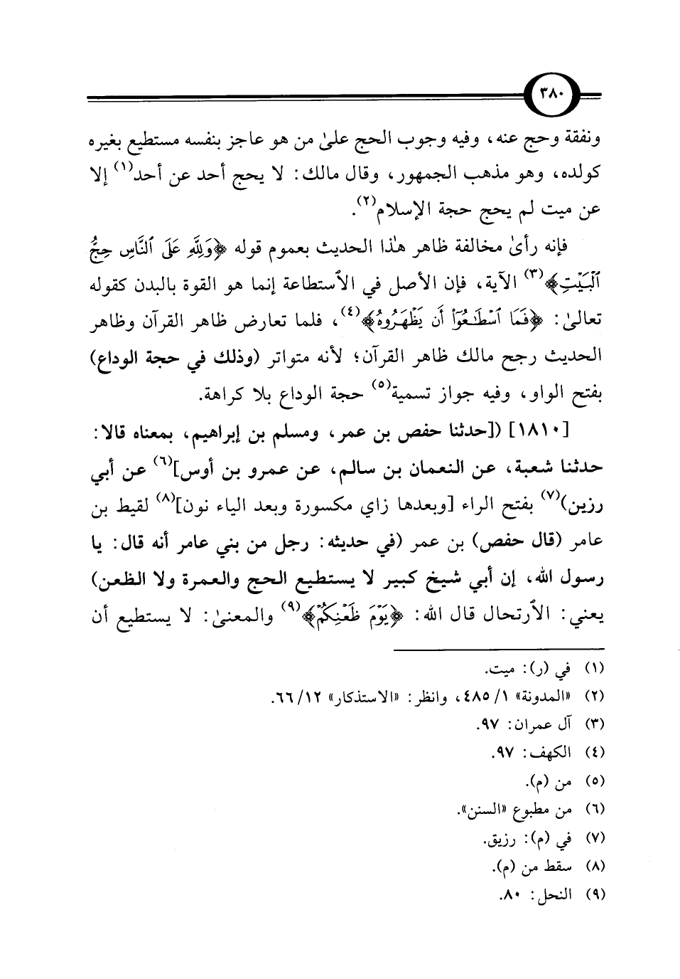 [1810] ([حدثنا حفص بن عمر، ومسلم بن إبراهيم، بمعناه قالا: حدثنا شعبة، عن النعمان بن سالم، عن عمرو بن أوس] (¬6) عن أبي رزين) (¬7) بفتح الراء [وبعدها زاي مكسورة وبعد الياء نون] (¬8) لقيط بن عامر (قال حفص) بن عمر (في حديثه: رجل من بني عامر أنه قال: يا رسول الله، إن أبي شيخ كبير لا يستطيع الحج والعمرة ولا الظعن) يعني: الارتحال قال الله: {يَوْمَ ظَعْنِكُمْ} (¬9) والمعنى: لا يستطيع أن
