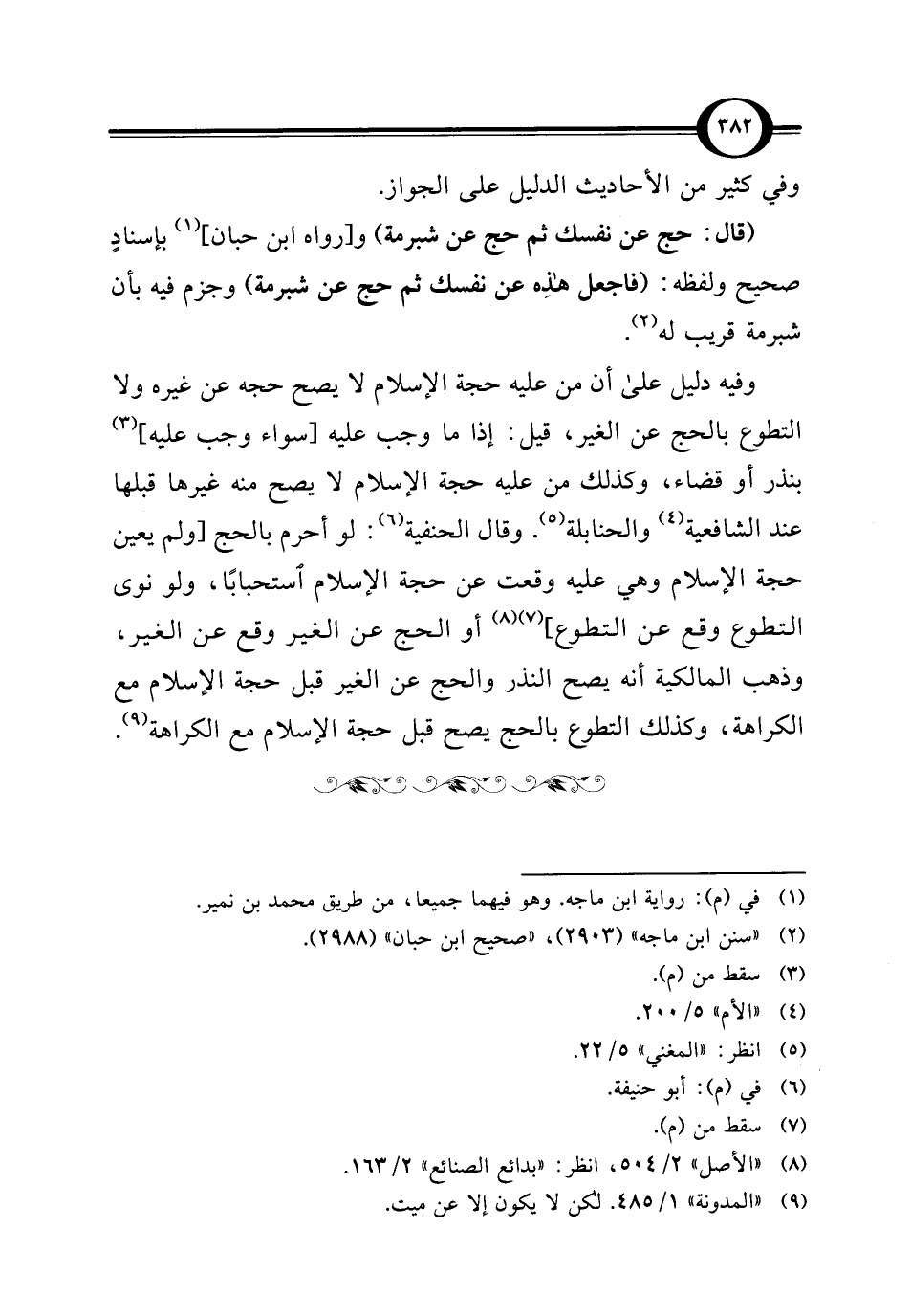 (قال: حج عن نفسك ثم حج عن شبرمة) و [رواه ابن حبان] (¬1) بإسنادٍ صحيح ولفظه: (فاجعل هذِه عن نفسك ثم حج عن شبرمة) وجزم فيه بأن شبرمة قريب له (¬2).