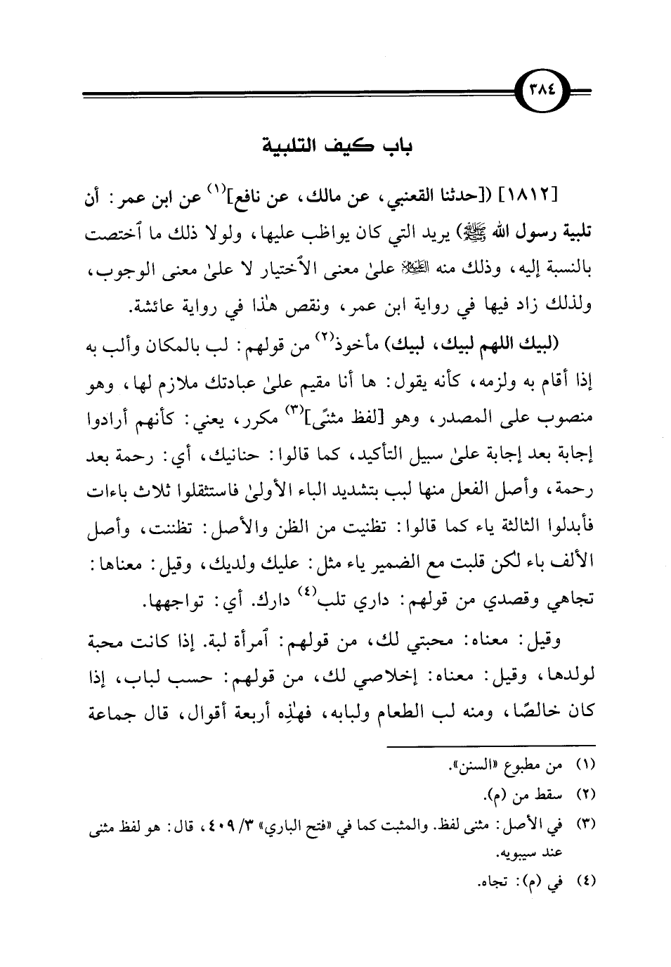[1812] ([حدثنا القعنبي، عن مالك، عن نافع] (¬1) عن ابن عمر: أن تلبية رسول الله - صلى الله عليه وسلم -) يريد التي كان يواظب عليها، ولولا ذلك ما اختصت بالنسبة إليه، وذلك منه - عليه السلام - على معنى الاختيار لا على معنى الوجوب، ولذلك زاد فيها في رواية ابن عمر، ونقص هذا في رواية عائشة.