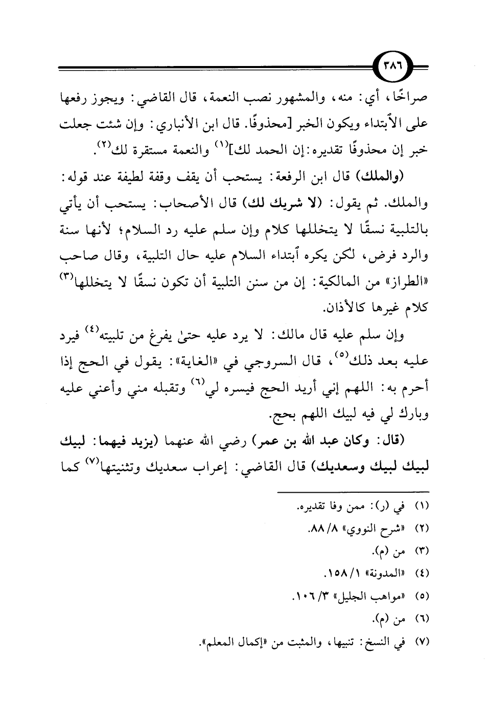 (والملك) قال ابن الرفعة: يستحب أن يقف وقفة لطيفة عند قوله: والملك. ثم يقول: (لا شريك لك) قال الأصحاب: يستحب أن يأتي بالتلبية نسقًا لا يتخللها كلام وإن سلم عليه رد السلام؛ لأنها سنة والرد فرض، لكن يكره ابتداء السلام عليه حال التلبية، وقال صاحب "الطراز" من المالكية: إن من سنن التلبية أن تكون نسقًا لا يتخللها (¬3) كلام غيرها كالأذان.