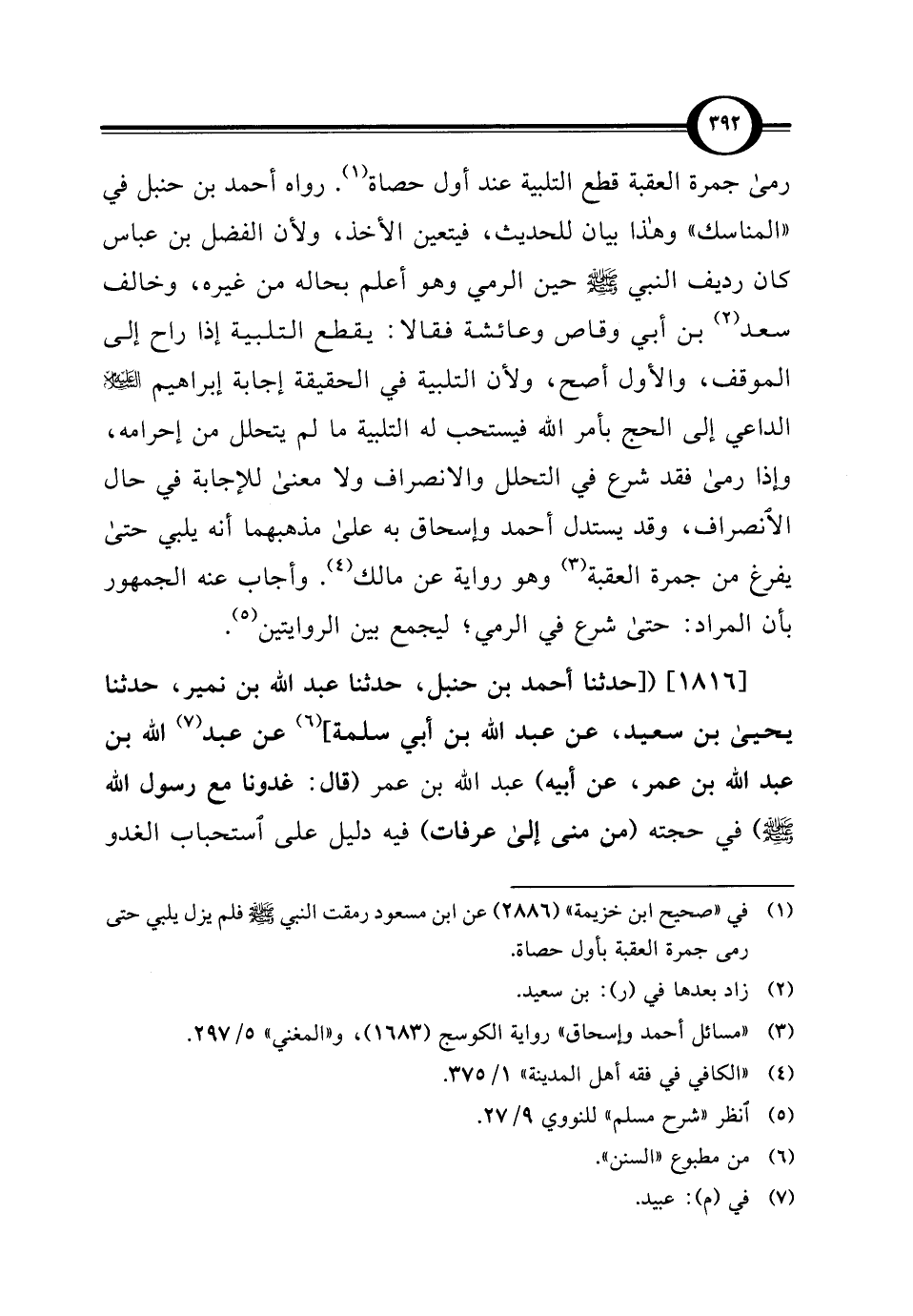 [1816] ([حدثنا أحمد بن حنبل، حدثنا عبد الله بن نمير، حدثنا يحيى بن سعيد، عن عبد الله بن أبي سلمة] (¬6) عن عبد (¬7) الله بن عبد الله بن عمر، عن أبيه) عبد الله بن عمر (قال: غدونا مع رسول الله - صلى الله عليه وسلم -) في حجته (من منى إلى عرفات) فيه دليل على استحباب الغدو