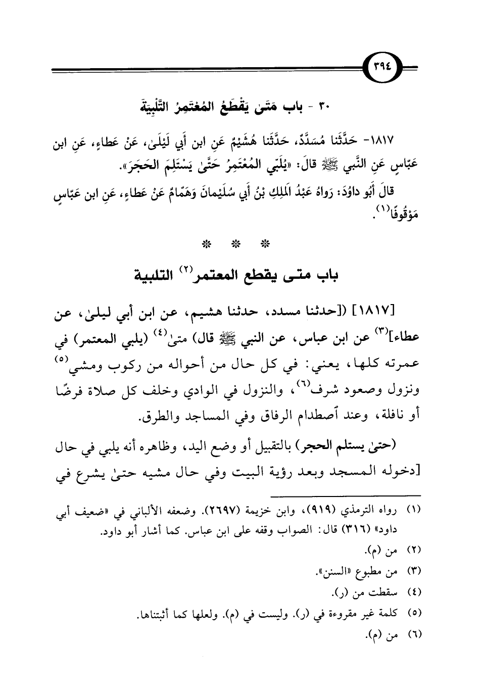 1817 - حَدَّثَنا مُسَدَّدٌ، حَدَّثَنا هُشَيْمٌ عَنِ ابن أَبي لَيْلَى، عَنْ عطَاءٍ، عَنِ ابن عَبَّاسٍ عَنِ النَّبي - صلى الله عليه وسلم - قَالَ: "يُلَبّي المُعْتَمِرُ حَتَّى يَسْتَلِمَ الحَجَرَ".