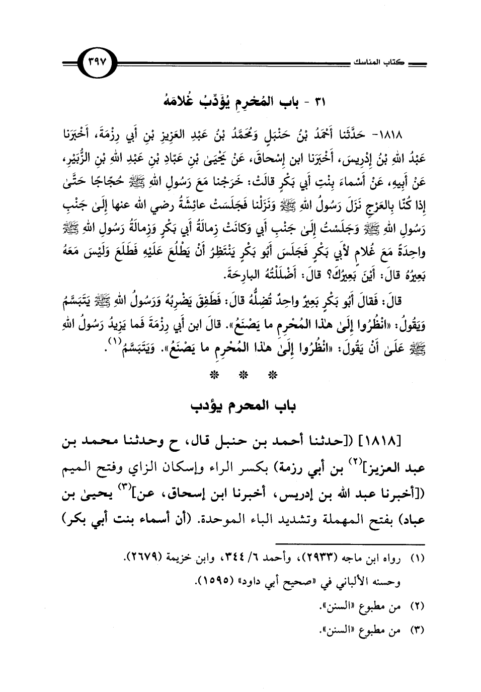 1818 - حَدَّثَنا أَحْمَدُ بْن حَنْبَلٍ وَمُحَمَّدُ بْنُ عَبْدِ العَزِيزِ بْنِ أَبي رِزْمَةَ، أَخْبَرَنا عَبْدُ اللهِ بْن إِدْرِيسَ، أَخْبَرَنا ابن إِسْحَاقَ، عَنْ يَحْيَى بْنِ عَبَّادِ بْنِ عَبْدِ اللهِ بْنِ الزُّبَيْرِ، عَنْ أَبِيهِ، عَنْ أَسْماءَ بِنْتِ أَبي بَكْرٍ قَالَتْ: خَرَجْنَا مَعَ رَسُولِ اللهِ - صلى الله عليه وسلم - حُجَّاجًا حَتَّى إِذَا كُنَّا بِالعَرْجِ نَزَلَ رَسُولُ اللهِ - صلى الله عليه وسلم - وَنَزَلْنا فَجَلَسَتْ عَائِشَةُ رضي الله عنها إِلَى جَنْبِ رَسُولِ اللهِ - صلى الله عليه وسلم - وَجَلَسْتُ إِلَى جَنْبِ أَبي وَكَانَتْ زِمالَةُ أَبي بَكْرٍ وَزِمالَةُ رَسُولِ اللهِ - صلى الله عليه وسلم - واحِدَةً مَعَ غُلامٍ لأَبِي بَكْرٍ فَجَلَسَ أَبُو بَكْرٍ يَنْتَظِرُ أَنْ يَطْلُعَ عَلَيْهِ فَطَلَعَ وَلَيْسَ مَعَهُ بَعِيرُهُ قَالَ: أَيْنَ بَعِيرُكَ؟ قَالَ: أَضْلَلْتُهُ البَارِحَةَ.