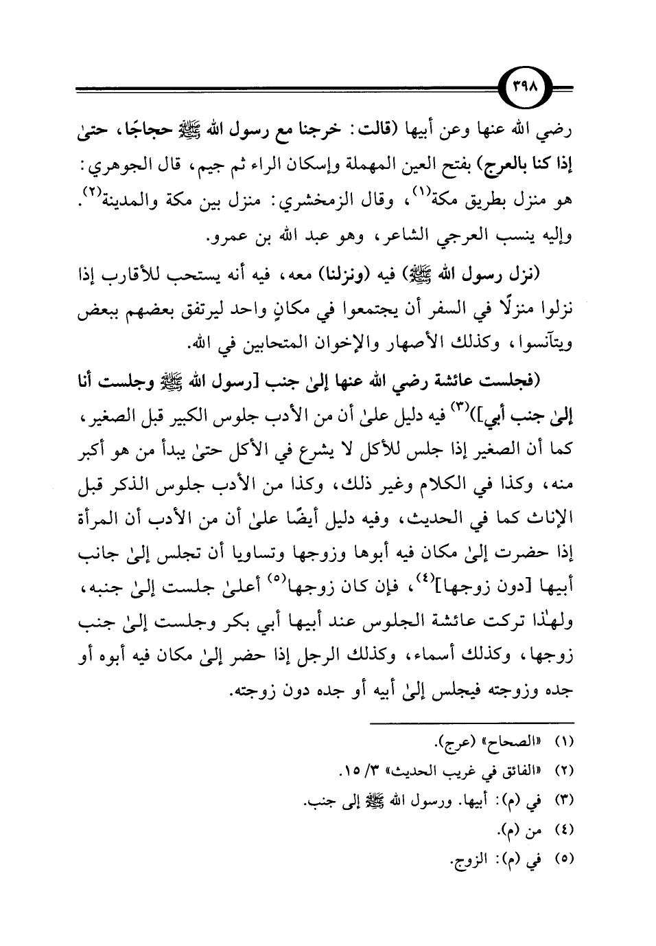 (فجلست عائشة رضي الله عنها إلى جنب [رسول الله - صلى الله عليه وسلم - وجلست أنا إلى جنب أبي]) (¬3) فيه دليل على أن من الأدب جلوس الكبير قبل الصغير، كما أن الصغير إذا جلس للأكل لا يشرع في الأكل حتى يبدأ من هو أكبر منه، وكذا في الكلام وغير ذلك، وكذا من الأدب جلوس الذكر قبل الإناث كما في الحديث، وفيه دليل أيضًا على أن من الأدب أن المرأة إذا حضرت إلى مكان فيه أبوها وزوجها وتساويا أن تجلس إلى جانب أبيها [دون زوجها] (¬4)، فإن كان زوجها (¬5) أعلى جلست إلى جنبه، ولهذا تركت عائشة الجلوس عند أبيها أبي بكر وجلست إلى جنب زوجها، وكذلك أسماء، وكذلك الرجل إذا حضر إلى مكان فيه أبوه أو جده وزوجته فيجلس إلى أبيه أو جده دون زوجته.