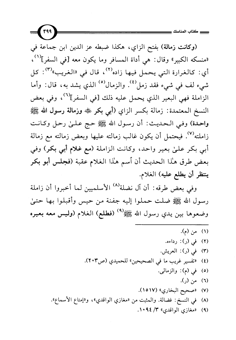 (وكانت زمالة) بفتح الزاي، هكذا ضبطه عز الدين ابن جماعة في "منسكه الكبير" وقال: هي أداة المسافر وما يكون معه [في السفر] (¬1)، أي: كالغرارة التي يحمل فيها زاده (¬2)، قال في "الغريب" (¬3): كل شيء لف في شيء فقد زمل (¬4). والزمال (¬5) الذي يشد به، قال: وأما الزاملة فهي البعير الذي يحمل عليه ذلك [في السفر] (¬6)، وفي بعض النسخ المعتمدة: زمالة بكسر الزاي (أبي بكر - رضي الله عنه - وزمالة رسول الله - صلى الله عليه وسلم - واحدة) وفي الحديث: أن رسول الله - صلى الله عليه وسلم - حج على رحل وكانت زاملته (¬7). فيحتمل أن يكون غالب زمالته عليها وبعض زمالته مع زمالة أبي بكر على بعير واحد، وكانت الزاملة (مع غلام أبي بكر) وفي بعض طرق هذا الحديث أن اسم هذا الغلام عقبة (فجلس أبو بكر ينتظر أن يطلع عليه) الغلام.