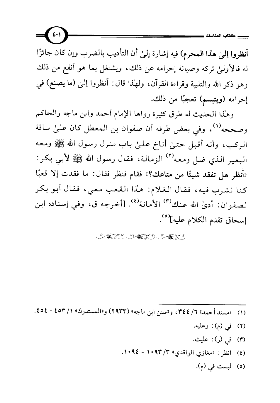 انظروا إلى هذا المحرم) فيه إشارة إلى أن التأديب بالضرب وإن كان جائزًا له فالأولى تركه وصيانة إحرامه عن ذلك، ويشتغل بما هو أنفع من ذلك وهو ذكر الله والتلبية وقراءة القرآن، ولهذا قال: انظروا إلى (ما يصنع) في إحرامه (ويتبسم) تعجبًا من ذلك.