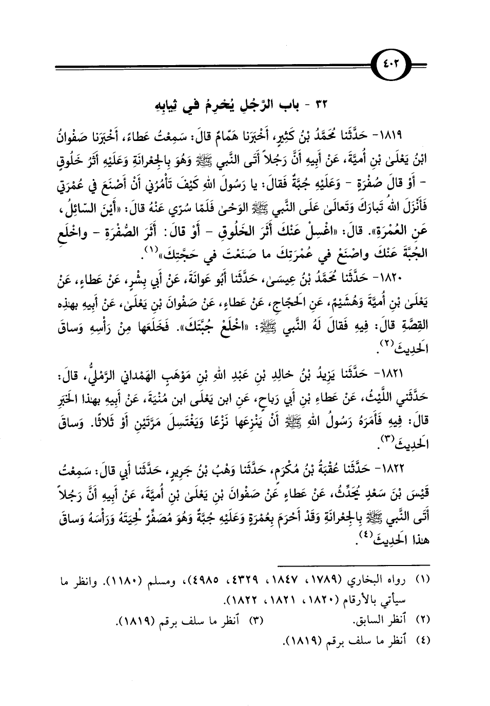 1822 - حَدَّثَنا عُقْبَةُ بْنُ مُكْرَمٍ، حَدَّثَنا وَهْبُ بْنُ جَرِيرٍ، حَدَّثَنا أَبِي قَالَ: سَمِعْتُ قَيْسَ بْنَ سَعْدٍ يُحَدِّثُ، عَنْ عَطَاءٍ عَنْ صَفْوانَ بْنِ يَعْلَى بْنِ أُمَيَّةَ، عَنْ أَبِيهِ أَنَّ رَجُلًا أَتَى النَّبِي - صلى الله عليه وسلم - بِالجِعْرانَةِ وَقَدْ أَحْرَمَ بِعُمْرَةٍ وَعَلَيْهِ جُبَّةٌ وَهُوَ مُصَفِّرٌ لِحْيَتَهُ وَرَأْسَهُ وَساقَ هذا الحَدِيثَ (¬4).
