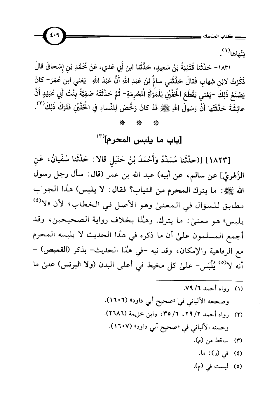 [1823] [(حدَّثَنا مُسَدَدٌ وَأَحْمَدُ بْنُ حَنْبَلٍ قالا: حَدَّثَنا سُفْيانُ، عَنِ الزُّهْريِّ] عن سالم، عن أبيه) عبد الله بن عمر (قال: سأل رجل رسول الله - صلى الله عليه وسلم -: ما يترك المحرم من الثياب؟ فقال: لا يلبس) هذا الجواب مطابق للسؤال في المعنى وهو الأصل في الخطاب؛ لأن "لا (¬4) يلبس" هو معنى: ما يترك. وهذا بخلاف رواية الصحيحين، وقد أجمع المسلمون على أن ما ذكره في هذا الحديث لا يلبسه المحرم مع الرفاهية والإمكان، وقد نبه - في هذا الحديث - بذكر (القميص) - أنه لا (¬5) يُلْبَس - على كل مخيط في أعلى البدن (ولا البرنس) على ما