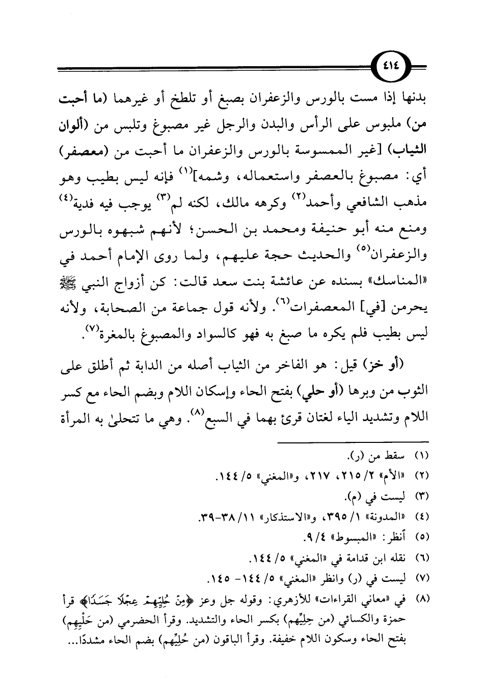 بدنها إذا مست بالورس والزعفران بصبغ أو تلطخ أو غيرهما (ما أحبت من) ملبوس على الرأس والبدن والرجل غير مصبوغ وتلبس من (ألوان الثياب) [غير الممسوسة بالورس والزعفران ما أحبت من (معصفر) أي: مصبوغ بالعصفر واستعماله، وشمه] (¬1) فإنه ليس بطيب وهو مذهب الشافعي وأحمد (¬2) وكرهه مالك، لكنه لم (¬3) يوجب فيه فدية (¬4) ومنع منه أبو حنيفة ومحمد بن الحسن؛ لأنهم شبهوه بالورس والزعفران (¬5) والحديث حجة عليهم، ولما روى الإمام أحمد في "المناسك" بسنده عن عائشة بنت سعد قالت: كن أزواج النبي - صلى الله عليه وسلم - يحرمن [في] المعصفرات (¬6). ولأنه قول جماعة من الصحابة، ولأنه ليس بطيب فلم يكره ما صبغ به فهو كالسواد والمصبوغ بالمغرة (¬7).