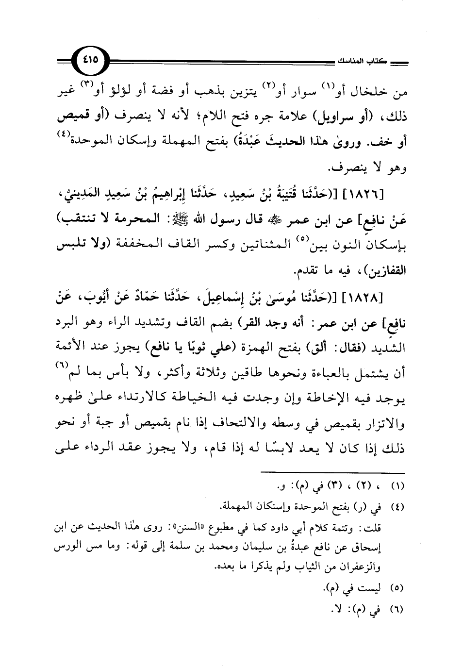 [1826] [(حَدَّثَنا قُتَيْبَةُ بْنُ سَعِيدٍ، حَدَّثَنا إِبْراهِيمُ بْنُ سَعِيدٍ المَدِينيُّ، عَنْ نافِعٍ] عن ابن عمر - رضي الله عنه - قال رسول الله - صلى الله عليه وسلم -: المحرمة لا تنتقب) بإسكان النون بين (¬5) المثناتين وكسر القاف المخففة (ولا تلبس القفازين)، فيه ما تقدم.
