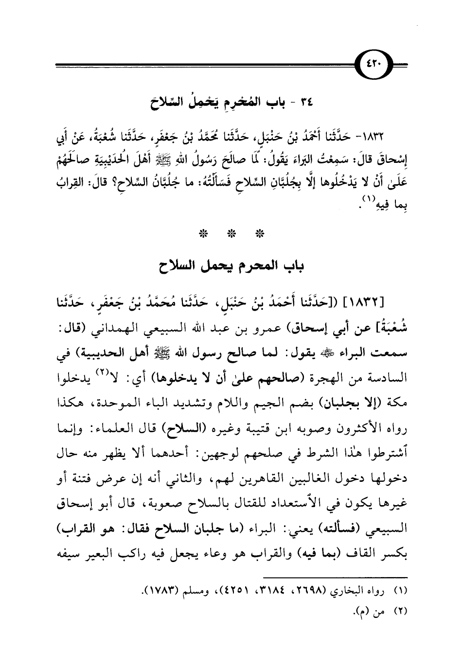 1832 - حَدَّثَنا أَحْمَدُ بْنُ حَنْبَلٍ، حَدَّثَنا مُحَمَّدُ بْنُ جَعْفَرٍ، حَدَّثَنا شُعْبَةُ، عَنْ أَبي إِسْحاقَ قَالَ: سَمِعْتُ البَرَاءَ يَقَولُ: لَمّا صالَحَ رَسُولُ اللهِ - صلى الله عليه وسلم - أَهْلَ الحُدَيْبِيَةِ صالَحَهُمْ عَلَى أَنْ لا يَدْخلُوها إِلَّا بِجُلُبَّانِ السِّلاحِ فَسَأَلْتُهُ: ما جُلُبَّانُ السِّلاحِ؟ قَالَ: القِرابُ بِما فِيهِ (¬1).