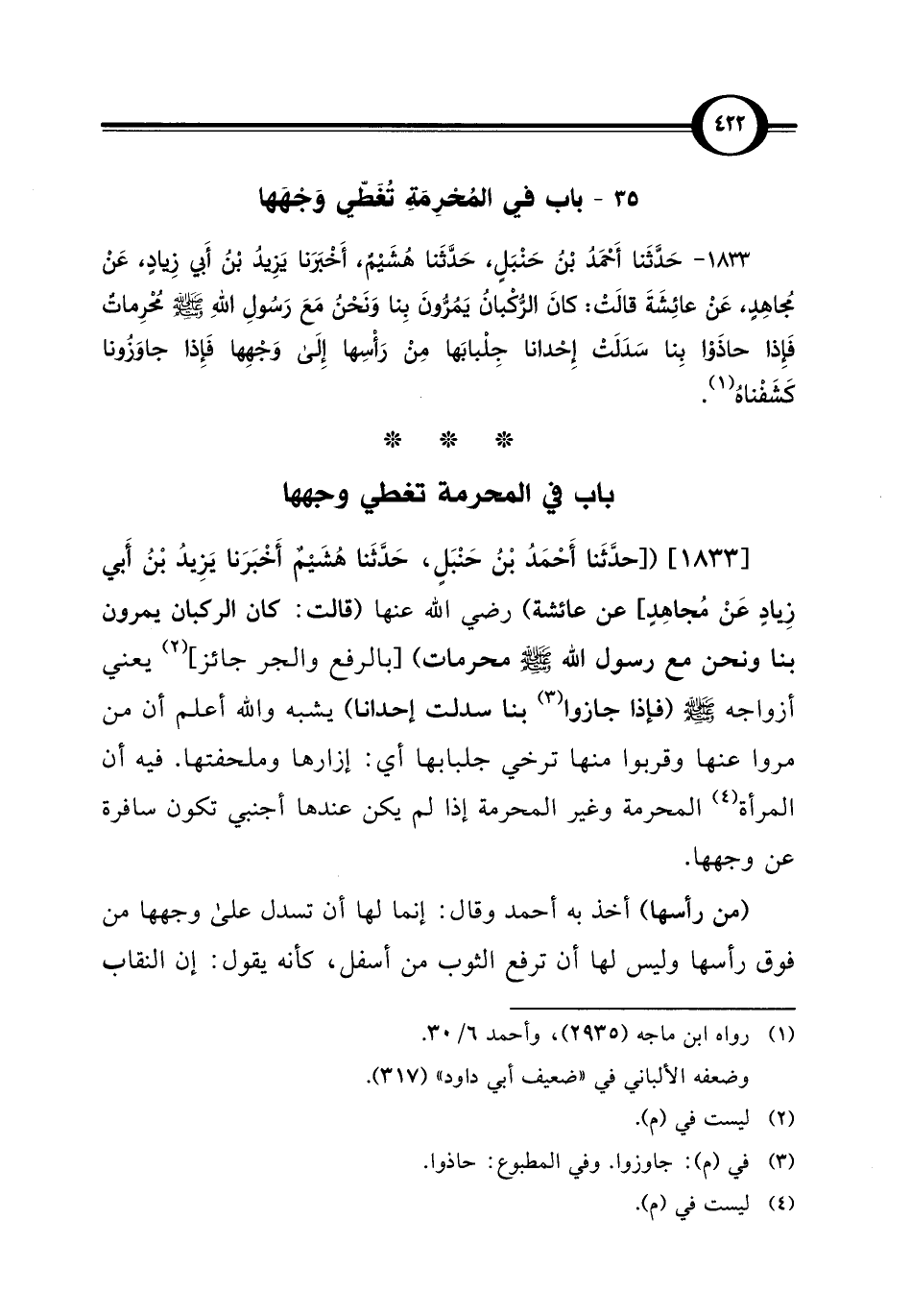 [1833] ([حدَّثَنا أَحْمَدُ بْنُ حَنْبَلٍ، حَدَّثَنا هُشَيْمٌ أَخْبَرَنا يَزِيدُ بْنُ أَبي زِيادٍ عَنْ مُجاهِدٍ] عن عائشة) رضي الله عنها (قالت: كان الركبان يمرون بنا ونحن مع رسول الله - صلى الله عليه وسلم - محرمات) [بالرفع والجر جائز] (¬2) يعني أزواجه - صلى الله عليه وسلم - (فإذا جازوا (¬3) بنا سدلت إحدانا) يشبه والله أعلم أن من مروا عنها وقربوا منها ترخي جلبابها أي: إزارها وملحفتها. فيه أن المرأة (¬4) المحرمة وغير المحرمة إذا لم يكن عندها أجنبي تكون سافرة عن وجهها.