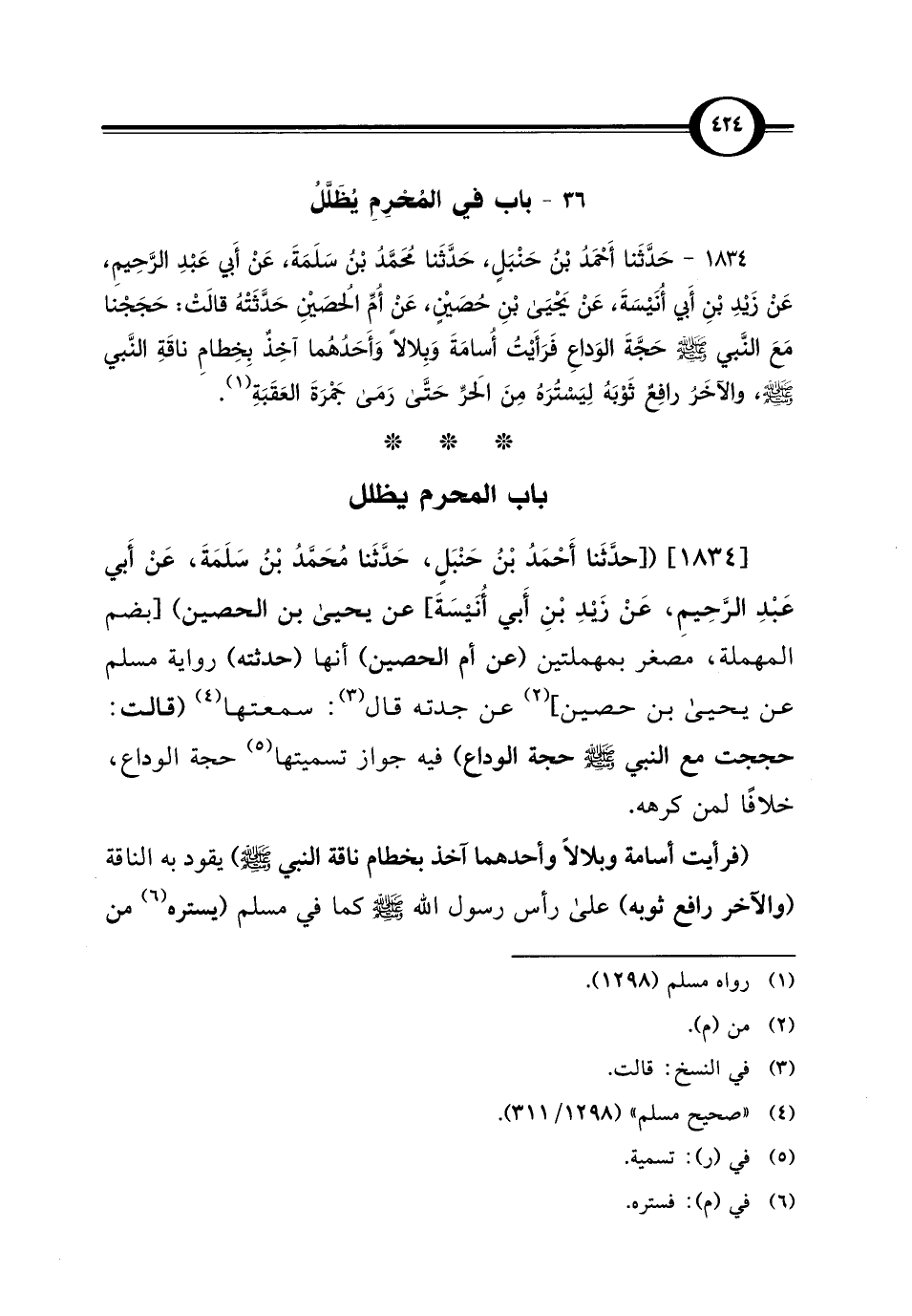 1834 - حَدَّثَنا أَحْمَدُ بْنُ حَنْبَلٍ، حَدَّثَنا مُحَمَّدُ بْنُ سَلَمَةَ، عَنْ أَبِي عَبْدِ الرَّحِيمِ، عَنْ زَيْدِ بْنِ أَبِي أُنَيْسَةَ، عَنْ يَحْيَى بْنِ حُصَيْنٍ، عَنْ أُمِّ الحُصَيْنِ حَدَّثَتْهُ قَالَتْ: حَجَجْنَا مَعَ النَّبي - صلى الله عليه وسلم - حَجَّةَ الوَدَاعِ فَرَأَيْتُ أُسَامَةَ وَبِلالًا وَأَحَدُهُمَا آخِذٌ بِخِطَامِ ناقَةِ النَّبي - صلى الله عليه وسلم -، والآخَرُ رافِعٌ ثَوْبَهُ لِيَسْتُرَهُ مِنَ الحَرِّ حَتَّى رَمَى جَمْرَةَ العَقَبَةِ (¬1).