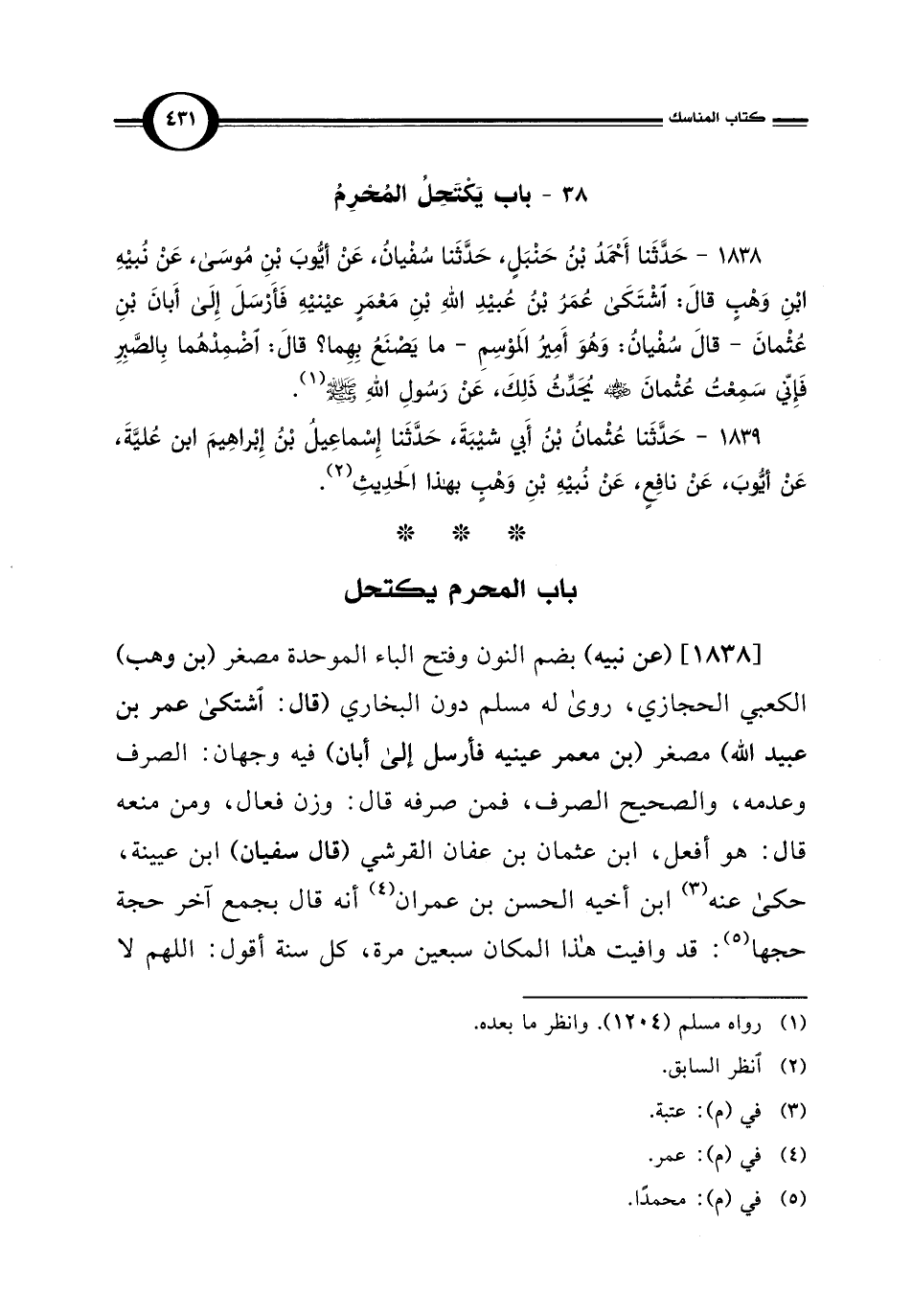 [1838] (عن نبيه) بضم النون وفتح الباء الموحدة مصغر (بن وهب) الكعبي الحجازي، روى له مسلم دون البخاري (قال: اشتكى عمر بن عبيد الله) مصغر (بن معمر عينيه فأرسل إلى أبان) فيه وجهان: الصرف وعدمه، والصحيح الصرف، فمن صرفه قال: وزن فعال، ومن منعه قال: هو أفعل، ابن عثمان بن عفان القرشي (قال سفيان) ابن عيينة، حكى عنه (¬3) ابن أخيه الحسن بن عمران (¬4) أنه قال بجمع آخر حجة حجها (¬5): قد وافيت هذا المكان سبعين مرة، كل سنة أقول: اللهم لا