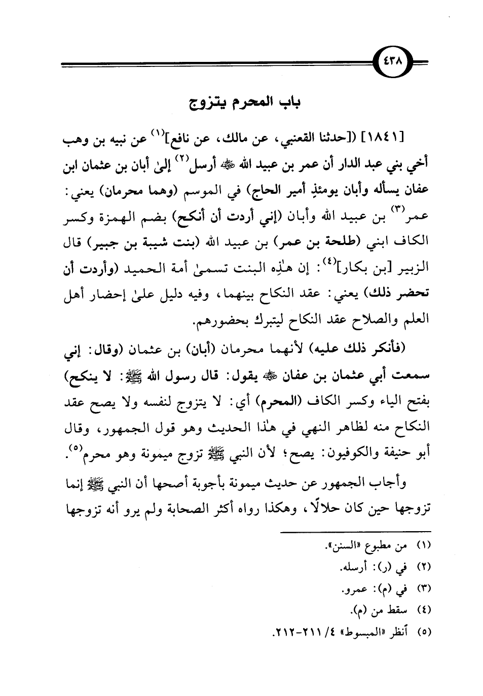 [1841] ([حدثنا القعنبي، عن مالك، عن نافع] (¬1) عن نبيه بن وهب أخي بني عبد الدار أن عمر بن عبيد الله - رضي الله عنه - أرسل (¬2) إلى أبان بن عثمان بن عفان يسأله وأبان يومئذٍ أمير الحاج) في الموسم (وهما محرمان) يعني: عمر (¬3) بن عبيد الله وأبان (إني أردت أن أنكح) بضم الهمزة وكسر الكاف ابني (طلحة بن عمر) بن عبيد الله (بنت شيبة بن جبير) قال الزبير [بن بكار] (¬4): إن هذِه البنت تسمى أمة الحميد (وأردت أن تحضر ذلك) يعني: عقد النكاح بينهما، وفيه دليل على إحضار أهل العلم والصلاح عقد النكاح ليتبرك بحضورهم.