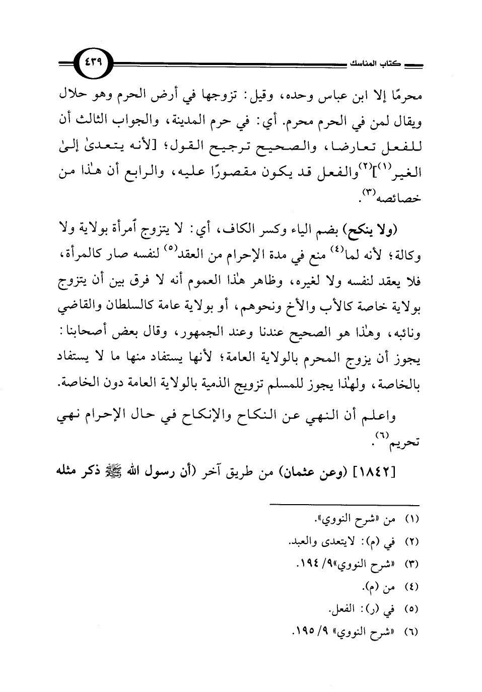 (ولا ينكح) بضم الياء وكسر الكاف، أي: لا يتزوج امرأة بولاية ولا وكالة؛ لأنه لما (¬4) منع في مدة الإحرام من العقد (¬5) لنفسه صار كالمرأة، فلا يعقد لنفسه ولا لغيره، وظاهر هذا العموم أنه لا فرق بين أن يتزوج بولاية خاصة كالأب والأخ ونحوهم، أو بولاية عامة كالسلطان والقاضي ونائبه، وهذا هو الصحيح عندنا وعند الجمهور، وقال بعض أصحابنا: يجوز أن يزوج المحرم بالولاية العامة؛ لأنها يستفاد منها ما لا يستفاد بالخاصة، ولهذا يجوز للمسلم تزويج الذمية بالولاية العامة دون الخاصة.