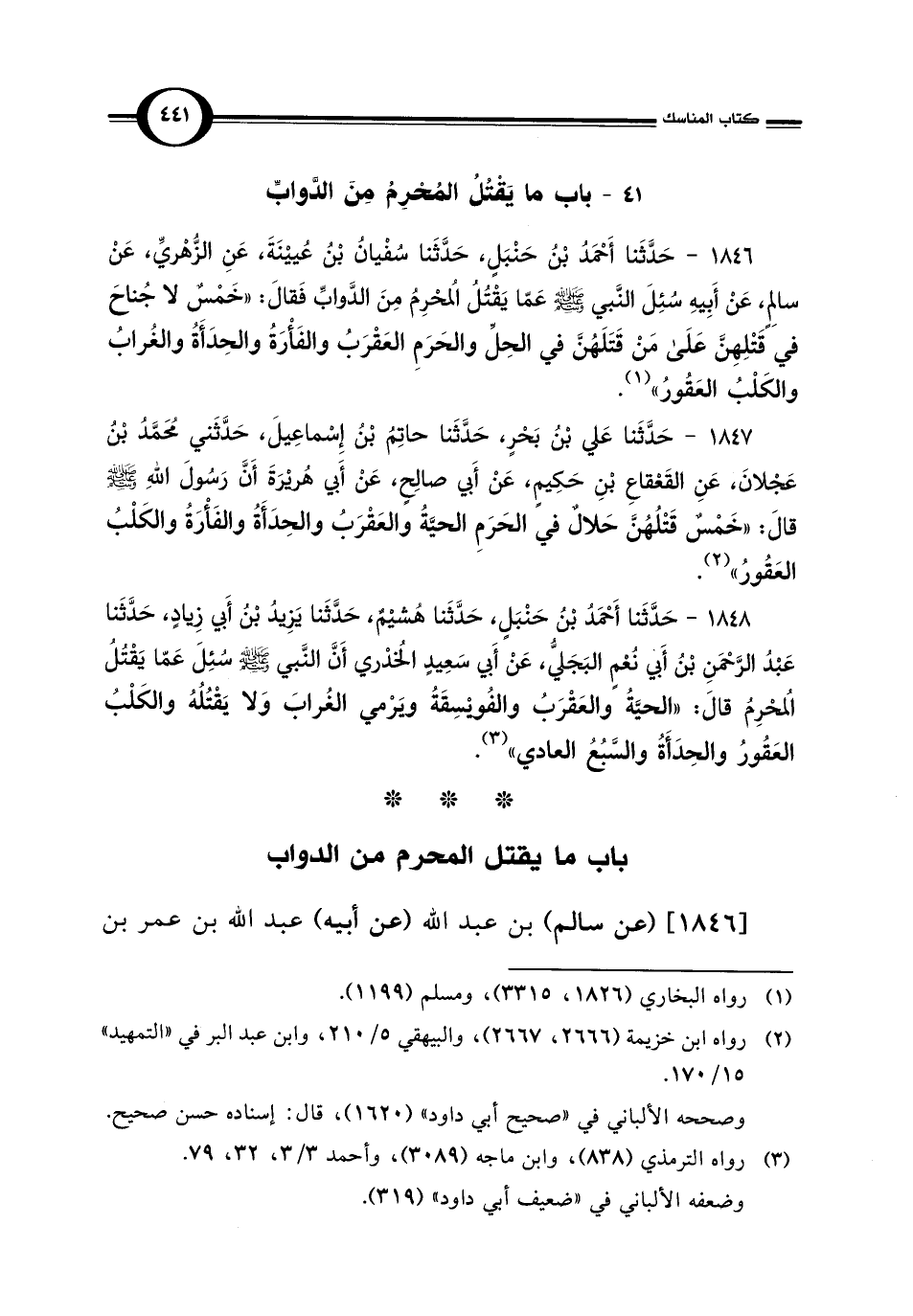 1846 - حَدَّثَنا أَحْمَدُ بْنُ حَنْبَلٍ، حَدَّثَنا سُفْيانُ بْنُ عُييْنَةَ، عَنِ الزُّهْريِّ، عَنْ سالِمٍ، عَنْ أَبِيهِ سُئِلَ النَّبي - صلى الله عليه وسلم - عَمّا يَقْتُلُ المُحْرِمُ مِنَ الدَّوابِّ فَقَالَ: "خَمْسٌ لا جُناحَ في قَتْلِهِنَّ عَلَى مَنْ قَتَلَهُنَّ في الحِلِّ والحَرَمِ العَقْرَبُ والفَأْرَةُ والحِدَأَةُ والغُرابُ والكَلْبُ العَقُورُ" (¬1).