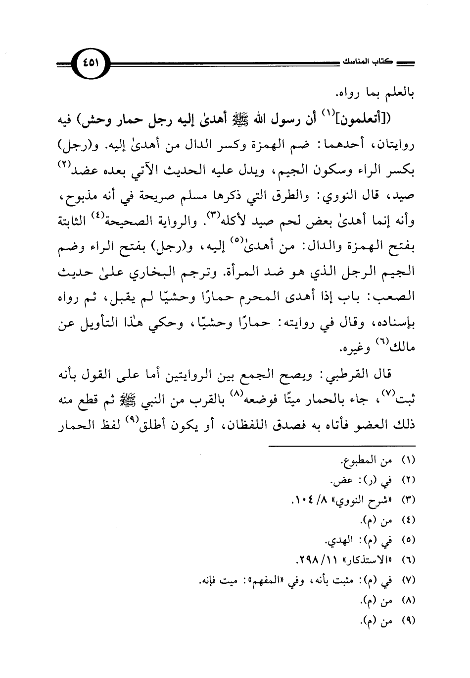 ([أتعلمون] (¬1) أن رسول الله - صلى الله عليه وسلم - أهدى إليه رجل حمار وحش) فيه روايتان، أحدهما: ضم الهمزة وكسر الدال من أهدى إليه. و (رجل) بكسر الراء وسكون الجيم، ويدل عليه الحديث الآتي بعده عضد (¬2) صيد، قال النووي: والطرق التي ذكرها مسلم صريحة في أنه مذبوح، وأنه إنما أهدى بعض لحم صيد لأكله (¬3). والرواية الصحيحة (¬4) الثابتة بفتح الهمزة والدال: من أهدى (¬5) إليه، و (رجل) بفتح الراء وضم الجيم الرجل الذي هو ضد المرأة. وترجم البخاري على حديث الصعب: باب إذا أهدى المحرم حمارًا وحشيّا لم يقبل، ثم رواه بإسناده، وقال في روايته: حمارًا وحشيّا، وحكي هذا التأويل عن مالك (¬6) وغيره.