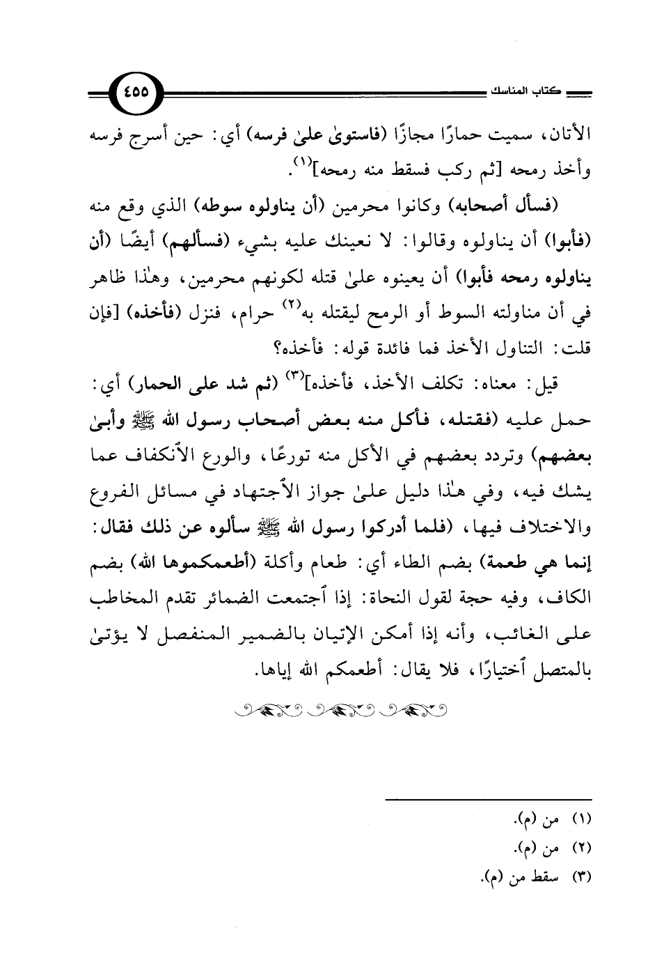 قيل: معناه: تكلف الأخذ، فأخذه] (¬3) (ثم شد على الحمار) أي: حمل عليه (فقتله، فأكل منه بعض أصحاب رسول الله - صلى الله عليه وسلم - وأبى بعضهم) وتردد بعضهم في الأكل منه تورعًا، والورع الانكفاف عما يشك فيه، وفي هذا دليل على جواز الاجتهاد في مسائل الفروع والاختلاف فيها، (فلما أدركوا رسول الله - صلى الله عليه وسلم - سألوه عن ذلك فقال: إنما هي طعمة) بضم الطاء أي: طعام وأكلة (أطعمكموها الله) بضم الكاف، وفيه حجة لقول النحاة: إذا اجتمعت الضمائر تقدم المخاطب على الغائب، وأنه إذا أمكن الإتيان بالضمير المنفصل لا يؤتى بالمتصل اختيارًا، فلا يقال: أطعمكم الله إياها.