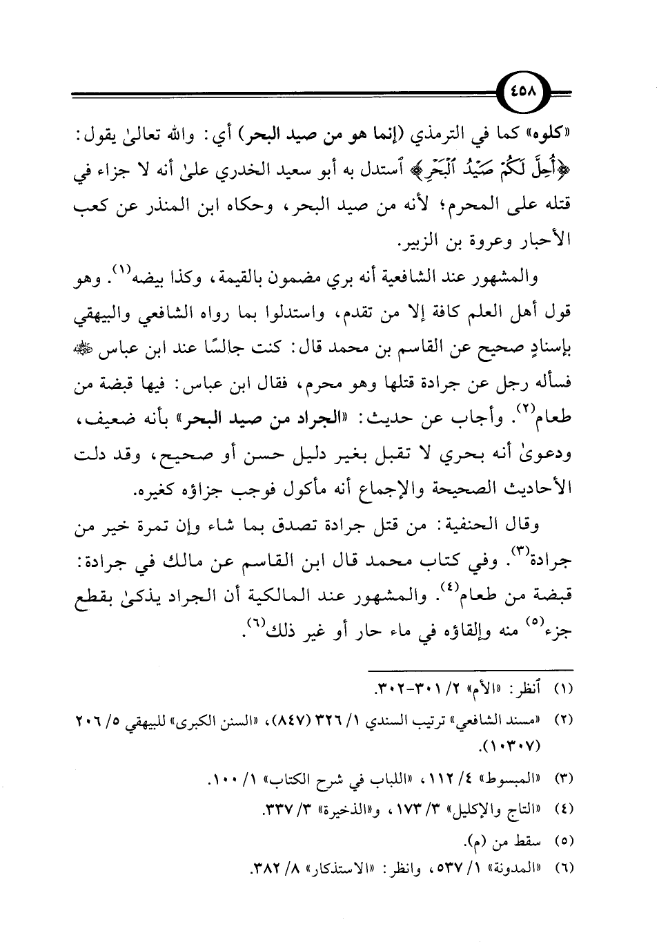 والمشهور عند الشافعية أنه بري مضمون بالقيمة، وكذا بيضه (¬1). وهو قول أهل العلم كافة إلا من تقدم، واستدلوا بما رواه الشافعي والبيهقي بإسنادٍ صحيح عن القاسم بن محمد قال: كنت جالسًا عند ابن عباس - رضي الله عنه - فسأله رجل عن جرادة قتلها وهو محرم، فقال ابن عباس: فيها قبضة من طعام (¬2). وأجاب عن حديث: "الجراد من صيد البحر" بأنه ضعيف، ودعوى أنه بحري لا تقبل بغير دليل حسن أو صحيح، وقد دلت الأحاديث الصحيحة والإجماع أنه مأكول فوجب جزاؤه كغيره.