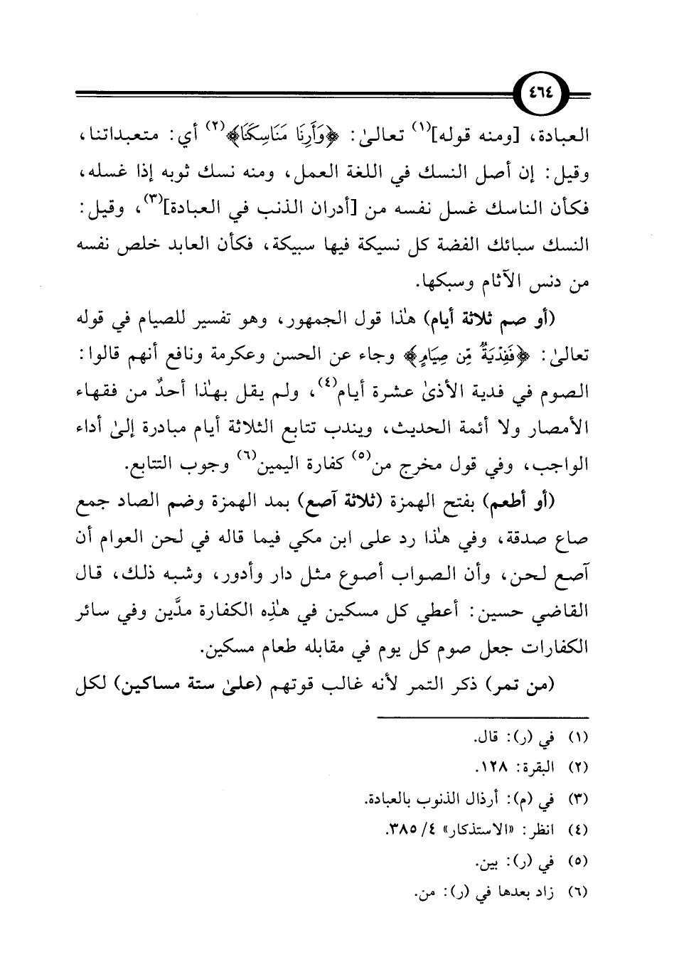 العبادة، [ومنه قوله] (¬1) تعالى: {وَأَرِنَا مَنَاسِكَنَا} (¬2) أي: متعبداتنا، وقيل: إن أصل النسك في اللغة العمل، ومنه نسك ثوبه إذا غسله، فكأن الناسك غسل نفسه من [أدران الذنب في العبادة] (¬3)، وقيل: النسك سبائك الفضة كل نسيكة فيها سبيكة، فكأن العابد خلص نفسه من دنس الآثام وسبكها.