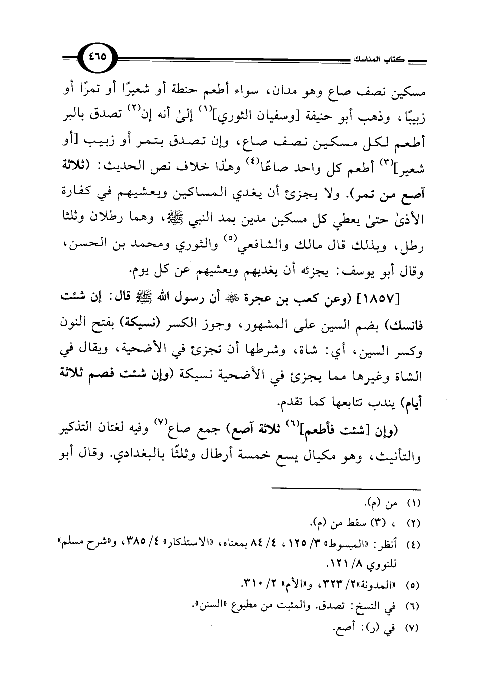 [1857] (وعن كعب بن عجرة - رضي الله عنه - أن رسول الله - صلى الله عليه وسلم - قال: إن شئت فانسك) بضم السين على المشهور، وجوز الكسر (نسيكة) بفتح النون وكسر السين، أي: شاة، وشرطها أن تجزئ في الأضحية، ويقال في الشاة وغيرها مما يجزئ في الأضحية نسيكة (وإن شئت فصم ثلاثة أيام) يندب تتابعها كما تقدم.