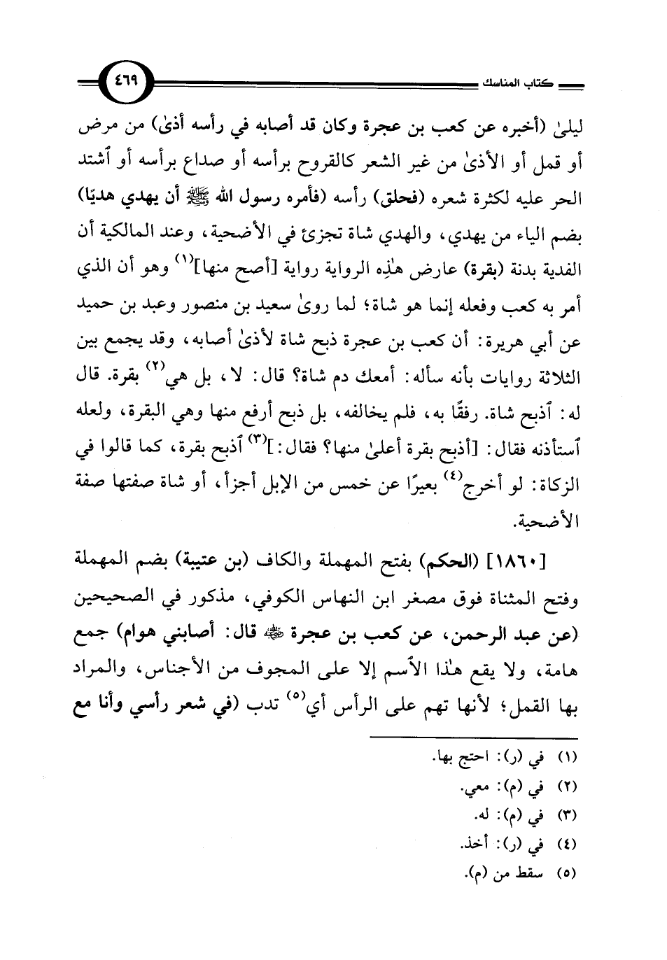 [1860] (الحكم) بفتح المهملة والكاف (بن عتيبة) بضم المهملة وفتح المثناة فوق مصغر ابن النهاس الكوفي، مذكور في الصحيحين (عن عبد الرحمن، عن كعب بن عجرة - رضي الله عنه - قال: أصابني هوام) جمع هامة، ولا يقع هذا الاسم إلا على المجوف من الأجناس، والمراد بها القمل؛ لأنها تهم على الرأس أي (¬5) تدب (في شعر رأسي وأنا مع