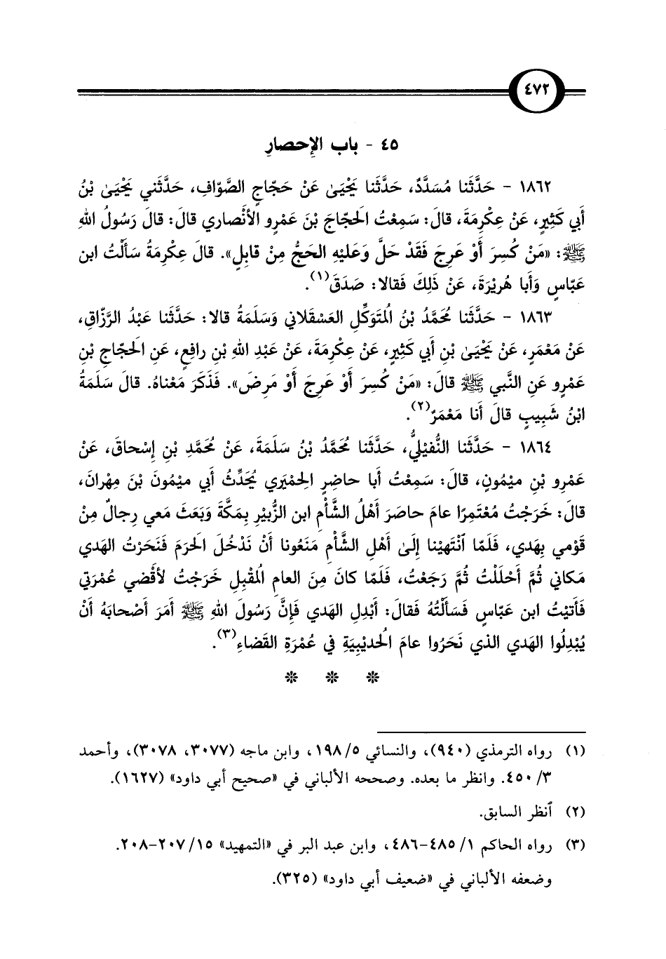 1862 - حَدَّثَنا مُسَدَّدٌ، حَدَّثَنا يَحْيَى عَنْ حَجّاجٍ الصَّوّافِ، حَدَّثَني يَحْيَى بْنُ أَبِي كَثِيرٍ، عَنْ عِكْرِمَةَ، قَالَ: سَمِعْنَا الحَجّاجَ بْنَ عَمْرٍو الأَنْصاري قَالَ: قَالَ رَسُولُ اللهِ - صلى الله عليه وسلم -: "مَنْ كُسِرَ أَوْ عَرِجَ فَقَدْ حَلَّ وَعَليْهِ الحَجُّ مِنْ قابِلٍ". قَالَ عِكْرِمَةُ سَأَلْتُ ابن عَبَّاسٍ وَأَبا هُريْرَةَ، عَنْ ذَلِكَ فَقالا: صَدَقَ (¬1).