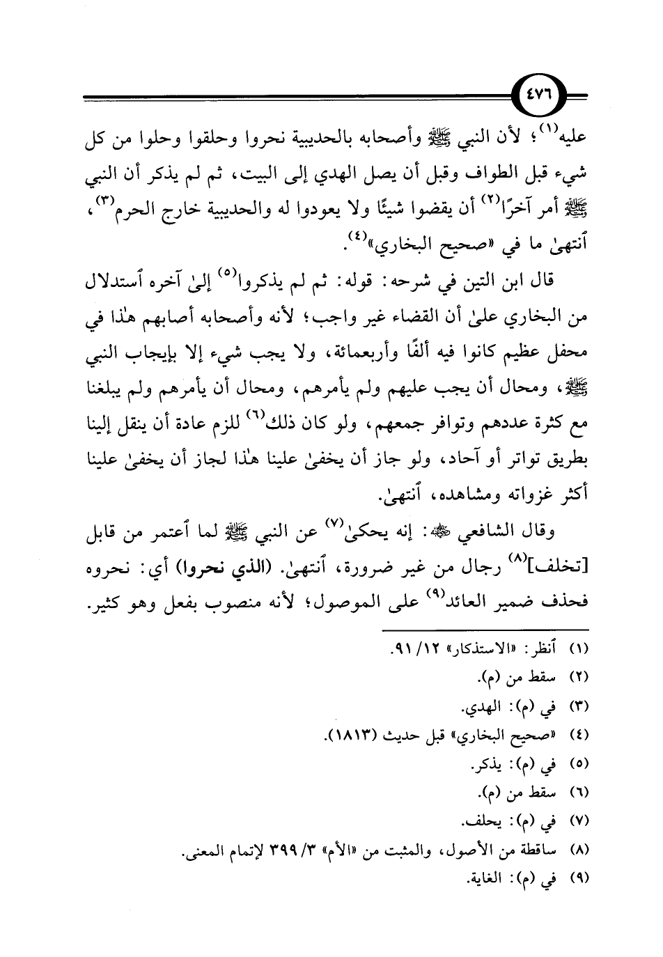 عليه (¬1)؛ لأن النبي - صلى الله عليه وسلم - وأصحابه بالحديبية نحروا وحلقوا وحلوا من كل شيء قبل الطواف وقبل أن يصل الهدي إلى البيت، ثم لم يذكر أن النبي - صلى الله عليه وسلم - أمر آخرًا (¬2) أن يقضوا شيئًا ولا يعودوا له والحديبية خارج الحرم (¬3)، انتهى ما في "صحيح البخاري" (¬4).