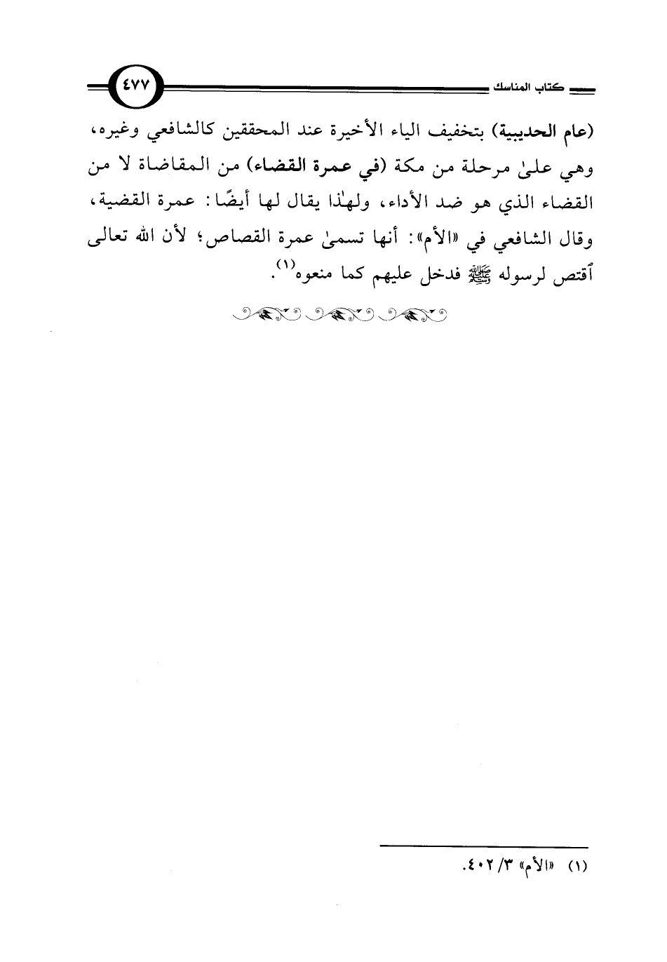 (عام الحديبية) بتخفيف الياء الأخيرة عند المحققين كالشافعي وغيره، وهي على مرحلة من مكة (في عمرة القضاء) من المقاضاة لا من القضاء الذي هو ضد الأداء، ولهذا يقال لها أيضًا: عمرة القضية، وقال الشافعي في "الأم": أنها تسمى عمرة القصاص؛ لأن الله تعالى اقتص لرسوله - صلى الله عليه وسلم - فدخل عليهم كما منعوه (¬1).