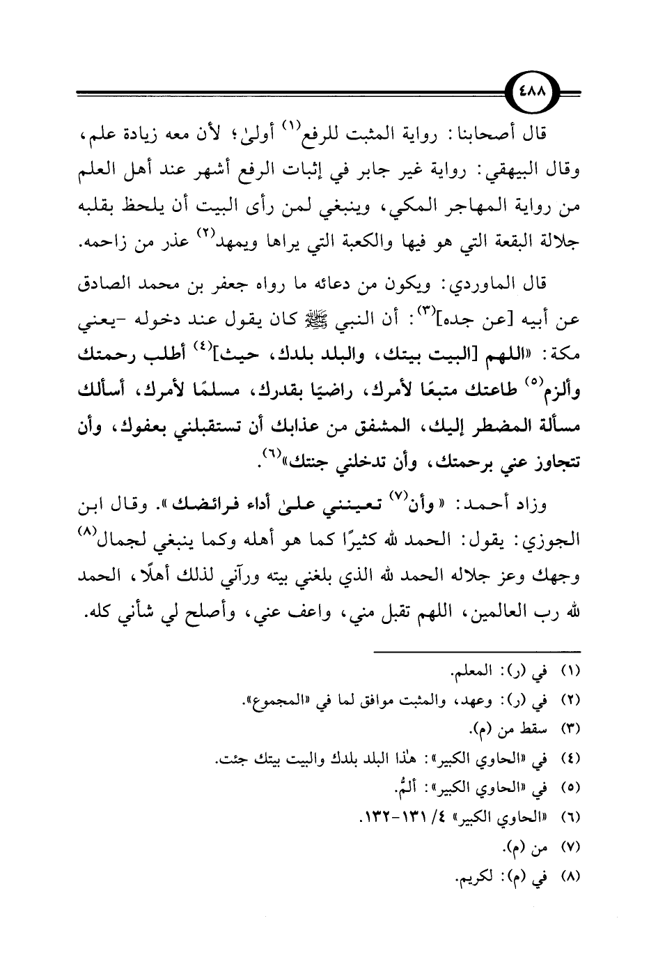 قال أصحابنا: رواية المثبت للرفع (¬1) أولى؛ لأن معه زيادة علم، وقال البيهقي: رواية غير جابر في إثبات الرفع أشهر عند أهل العلم من رواية المهاجر المكي، وينبغي لمن رأى البيت أن يلحظ بقلبه جلالة البقعة التي هو فيها والكعبة التي يراها ويمهد (¬2) عذر من زاحمه.