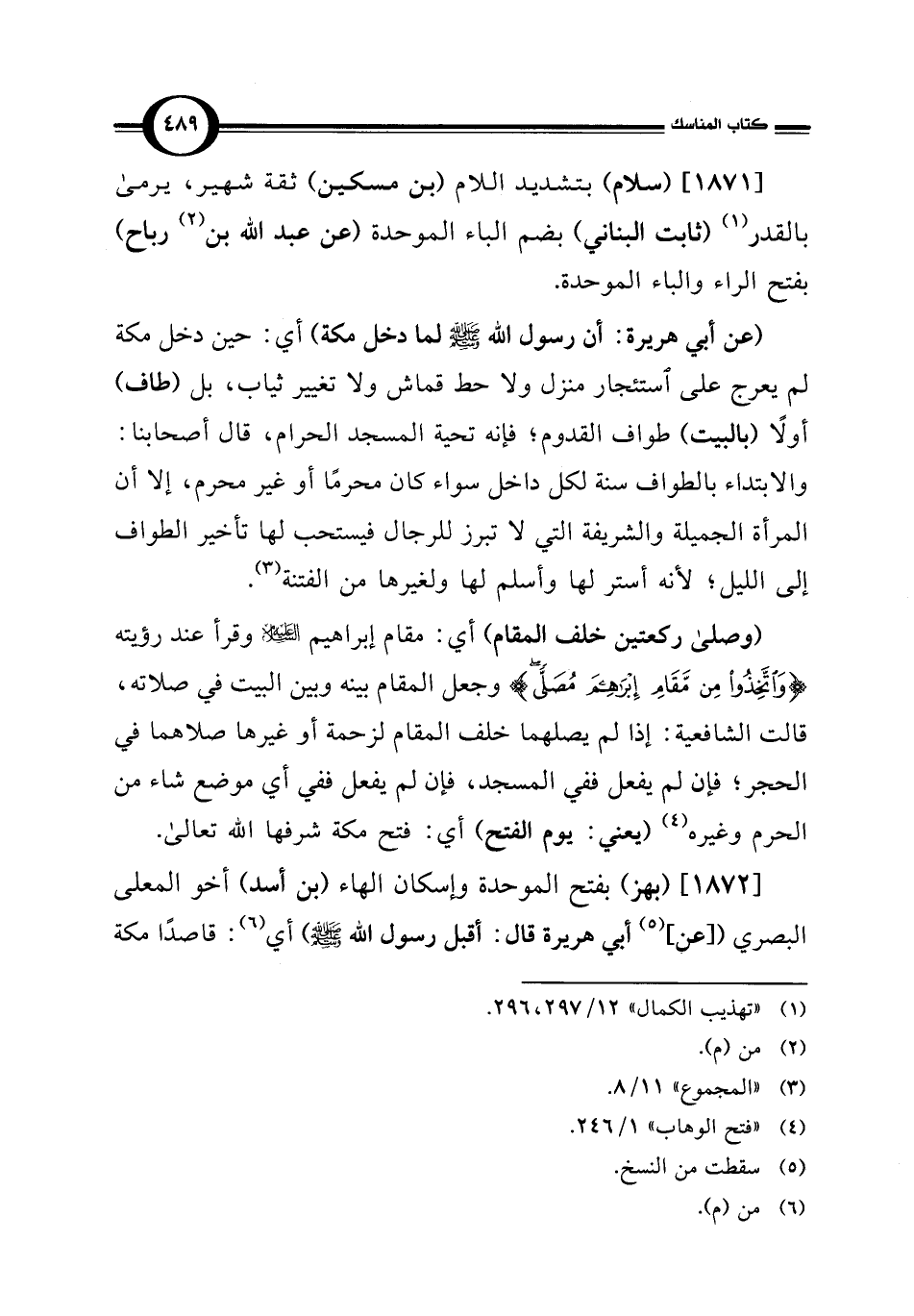 [1871] (سلام) بتشديد اللام (بن مسكين) ثقة شهير، يرمى بالقدر (¬1) (ثابت البناني) بضم الباء الموحدة (عن عبد الله بن (¬2) رباح) بفتح الراء والباء الموحدة.