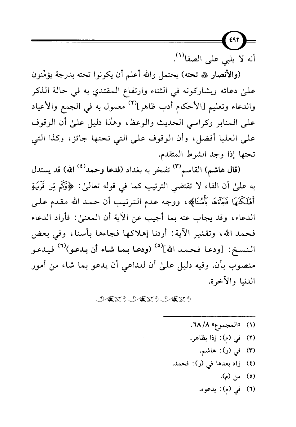 (قال هاشم) القاسم (¬3) تفتخر به بغداد (فدعا وحمد (¬4) الله) قد يستدل به على أن الفاء لا تقتضي الترتيب كما في قوله تعالى: {وَكَمْ مِنْ قَرْيَةٍ أَهْلَكْنَاهَا فَجَاءَهَا بَأْسُنَا}، ووجه عدم الترتيب أن حمد الله مقدم على الدعاء، وقد يجاب عنه بما أجيب عن الآية أن المعنى: فأراد الدعاء فحمد الله، وتقدير الآية: أردنا إهلاكها فجاءها بأسنا، وفي بعض النسخ: [ودعا فحمد الله] (¬5) (ودعا بما شاء أن يدعو) (¬6) فيدعو منصوب بأن. وفيه دليل على أن للداعي أن يدعو بما شاء من أمور الدنيا والآخرة.
