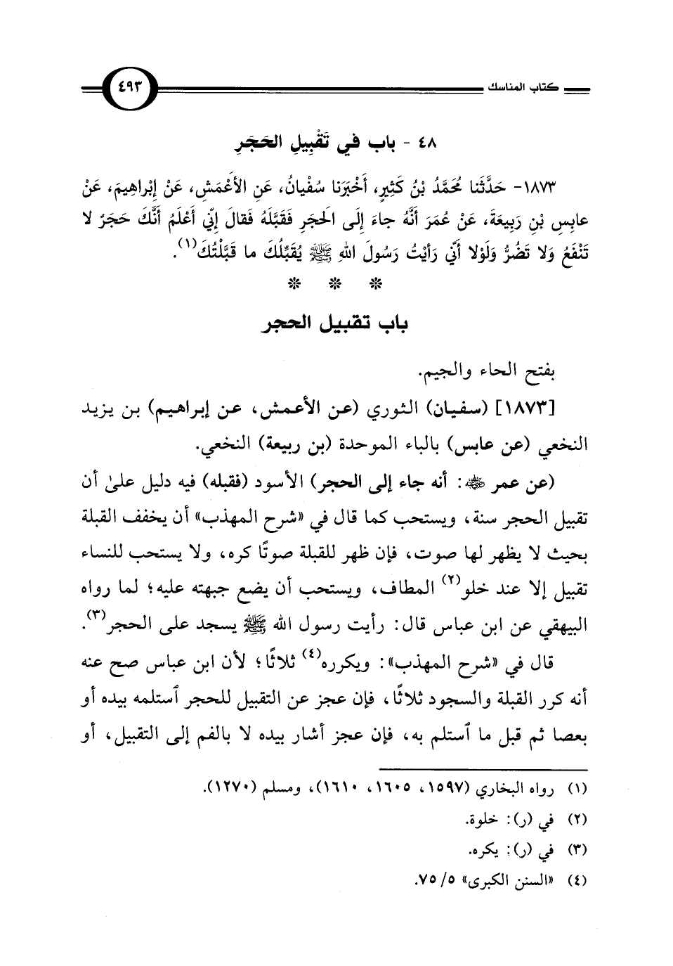 1873 - حَدَّثَنا مُحَمَّدُ بْنُ كَثِيرٍ، أَخْبَرَنا سُفْيانُ، عَنِ الأَعْمَشِ، عَنْ إِبْراهِيمَ، عَنْ عابِسِ بْنِ رَبِيعَةَ، عَنْ عُمَرَ أَنَّهُ جاءَ إِلَى الحَجَرِ فَقَبَّلَهُ فَقَالَ إِنِّي أَعْلَمُ أَنَّكَ حَجَرٌ لا تَنْفَعُ وَلا تَضُرُّ وَلَوْلا أَنّي رَأيْتُ رَسُولَ اللهِ - صلى الله عليه وسلم - يُقَبِّلُكَ ما قَبَّلْتُكَ (¬1).